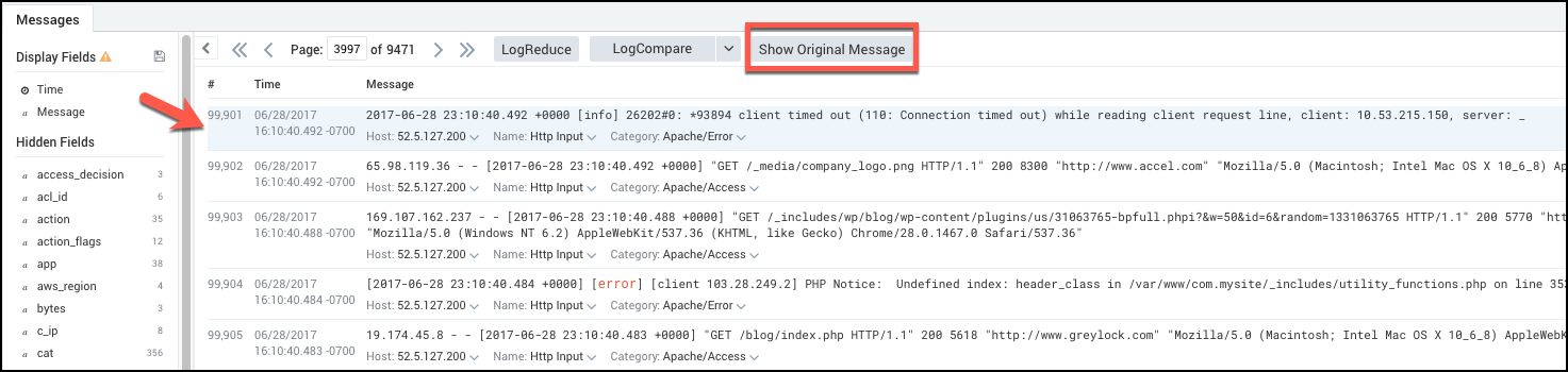 As you browse results in the Messages list, you might come across a message where you'd like to see more context. What other events occurred just before and after this event? What else was happening on this host at the same time? When you search surrounding messages, you capture the context of the current message to gain insight into surrounding activity.