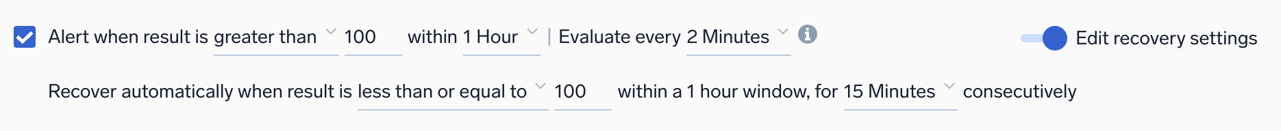 The recovery condition is set by default to the opposite of the alert condition. If you need to change these settings, switch on the Edit recovery settings toggle and then adjust values for the recovery settings accordingly.
