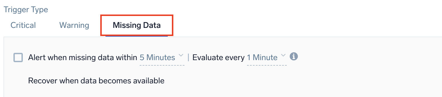 Alert when missing data within <time range - trigger>. Evaluate every <trigger - frequency>.