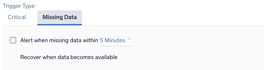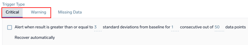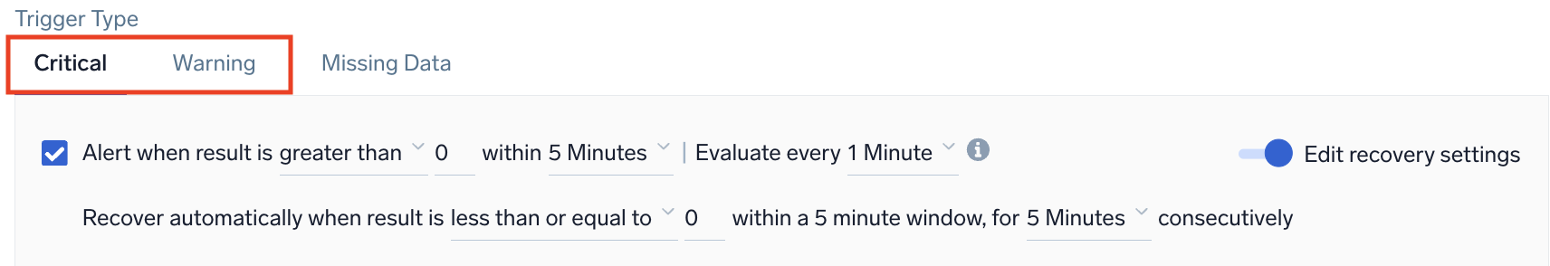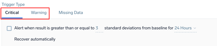 - Trigger Type Notifications. Set different notification channels for each trigger type (Critical, Warning, Missing Data). Select the Alert and Recovery checkboxes for each trigger type based on when you want to send a notification. You can have different Trigger Conditions send a notification to different channels. For example, you can get notified on PagerDuty for critical Incidents and get an email or Slack notification for warning incidents.
