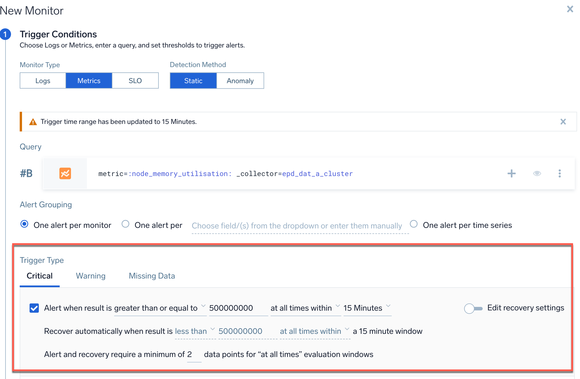 For Metrics monitors, you can choose to recover based on a single data point below the threshold, or all data points below the threshold.