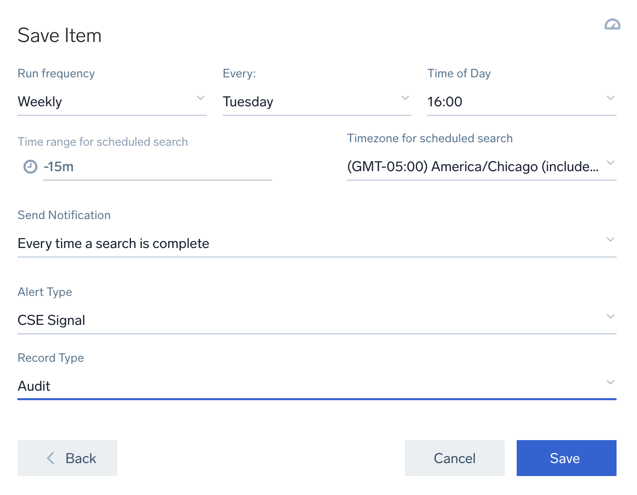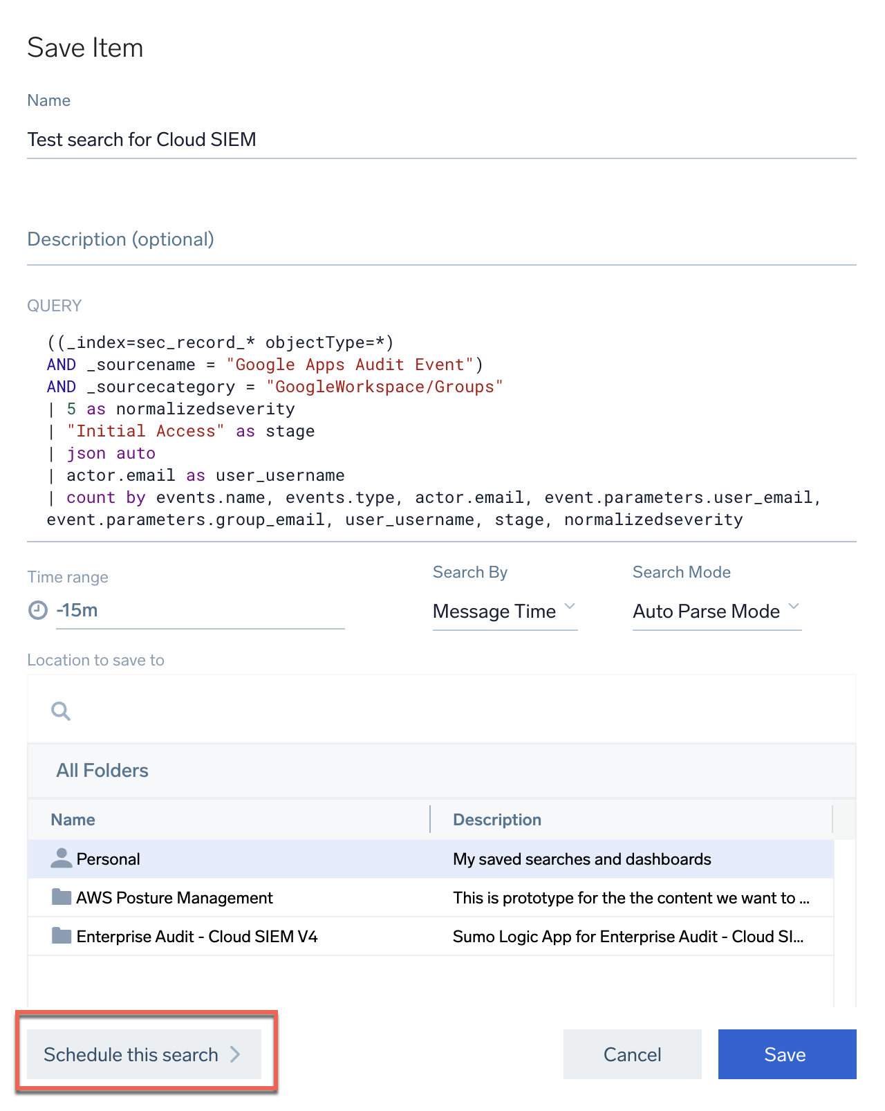noteThe name of your scheduled search will appear as the signal name in Cloud SIEM.