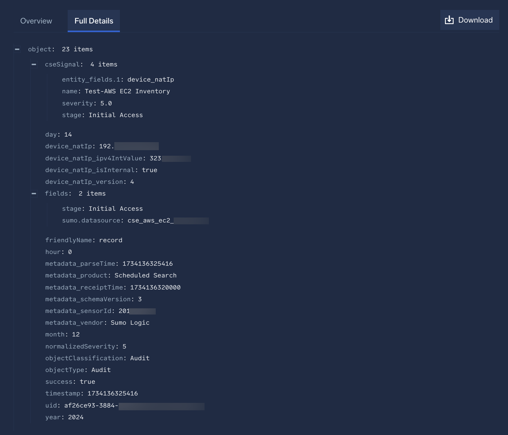- Click a signal from the list. Below is a screenshot of a signal that was created from a scheduled search. Note that: