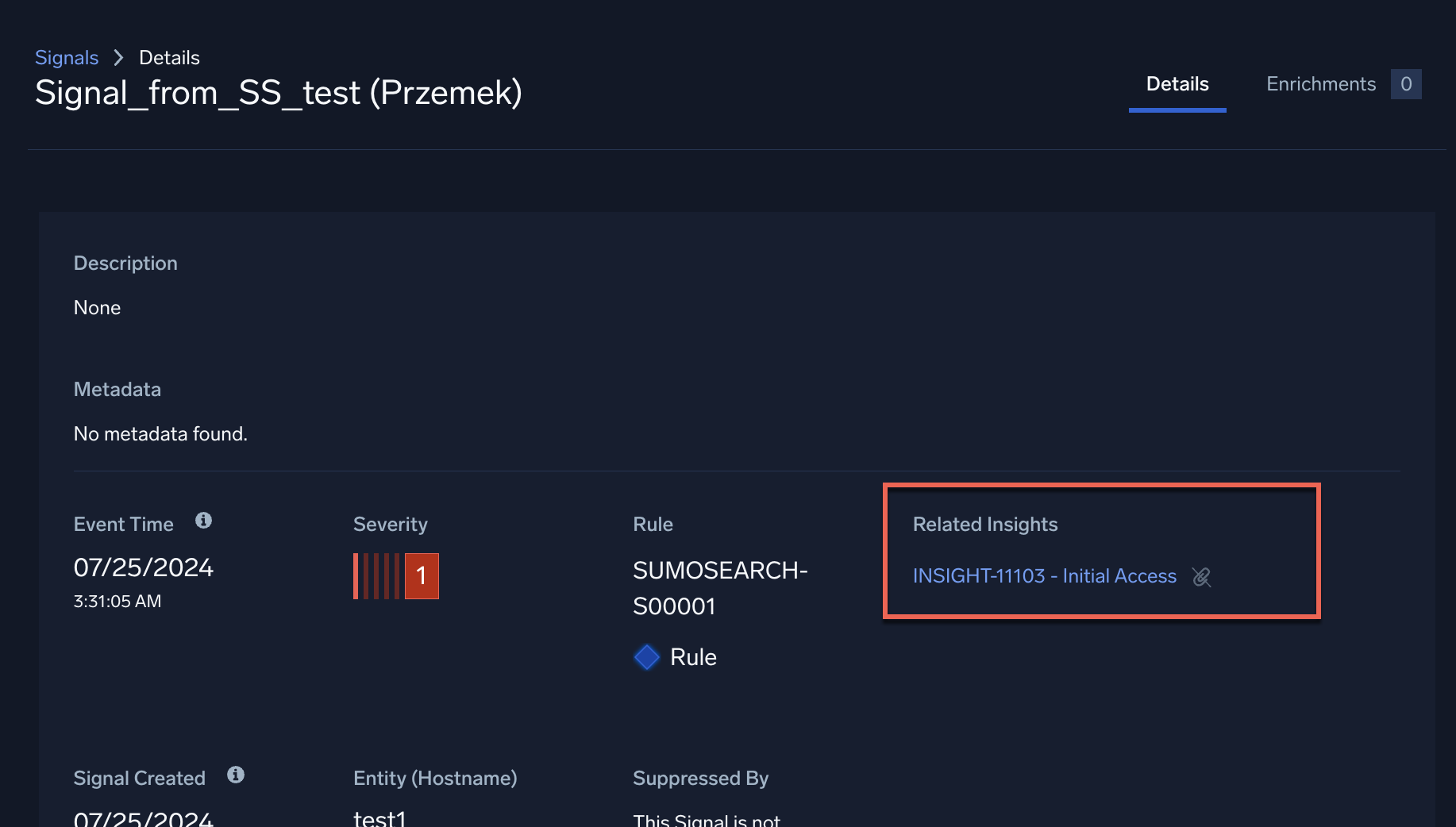 - Related Insights shows the insights the signal is included with. If the signal is not part of an insight, there’s a Create Insight link you can use to create an insight for the signal. Click Create Insight.