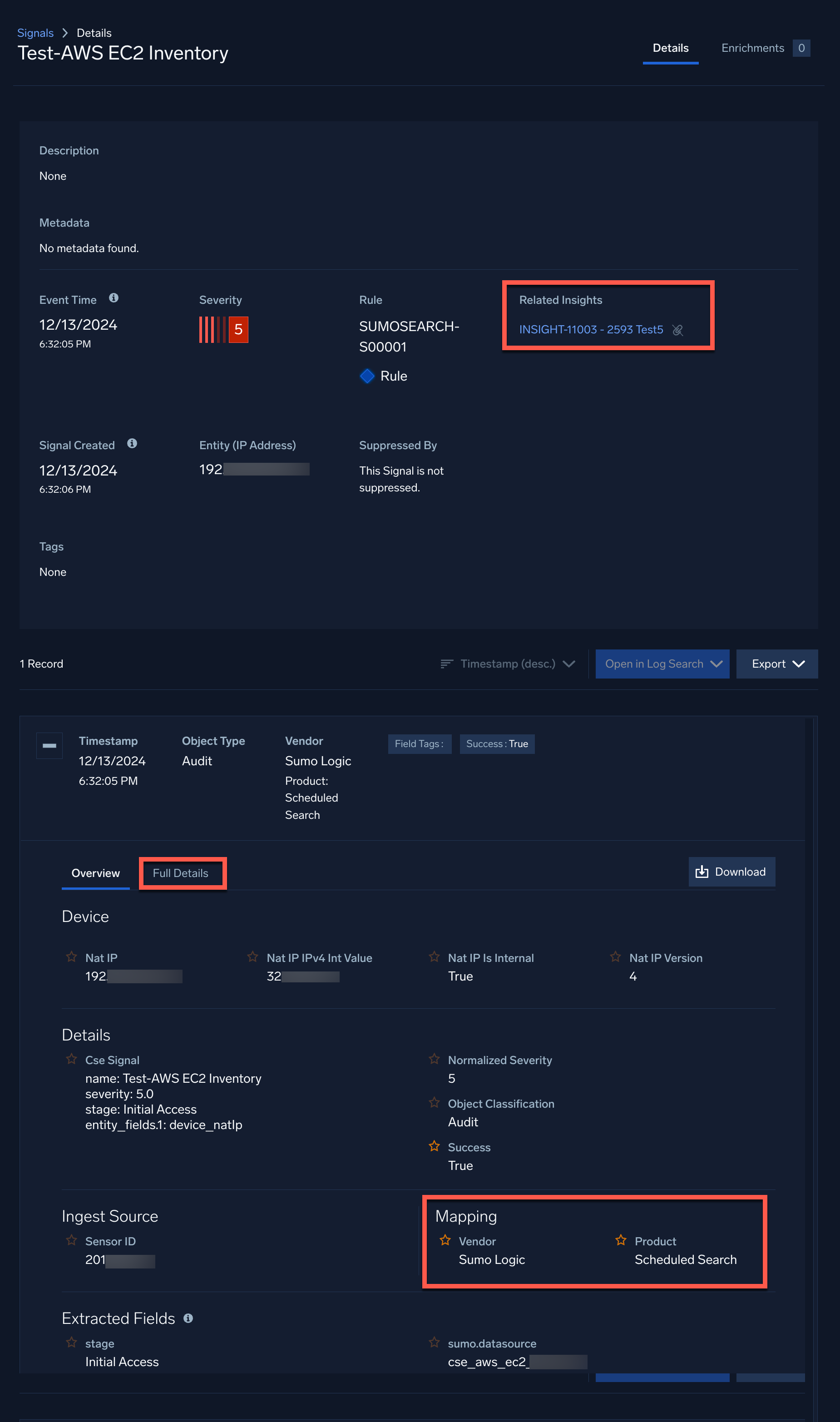 - The Mapping section at the bottom of the page shows that the signal was the result of a scheduled search.
