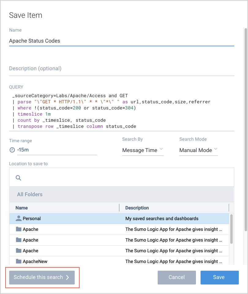 - On the Save Item popup, click Schedule this search.