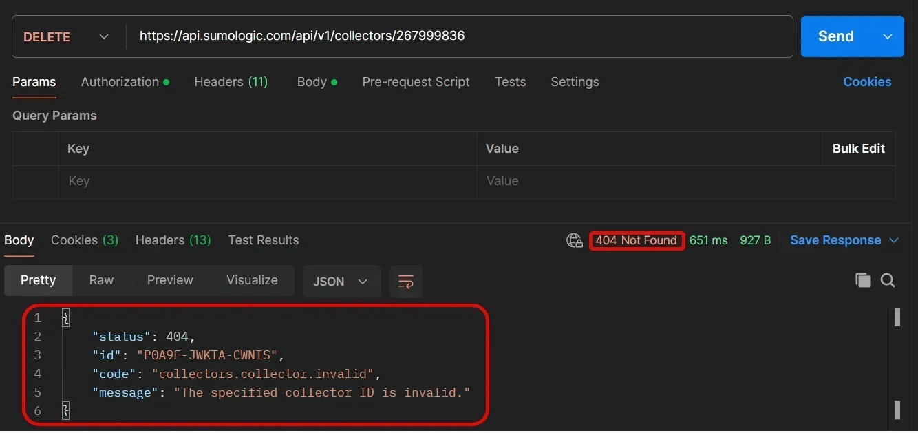 If the operation fails, you see a 400 or 500 level HTTP error code (depending on the specific error), along with a response body containing more detailed error information (such as an invalid collector ID).