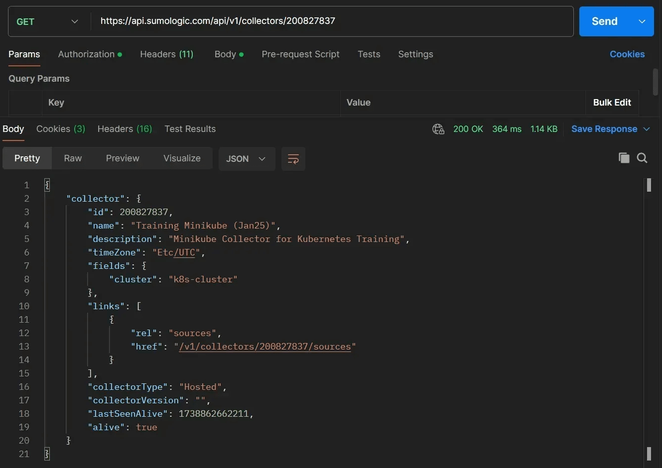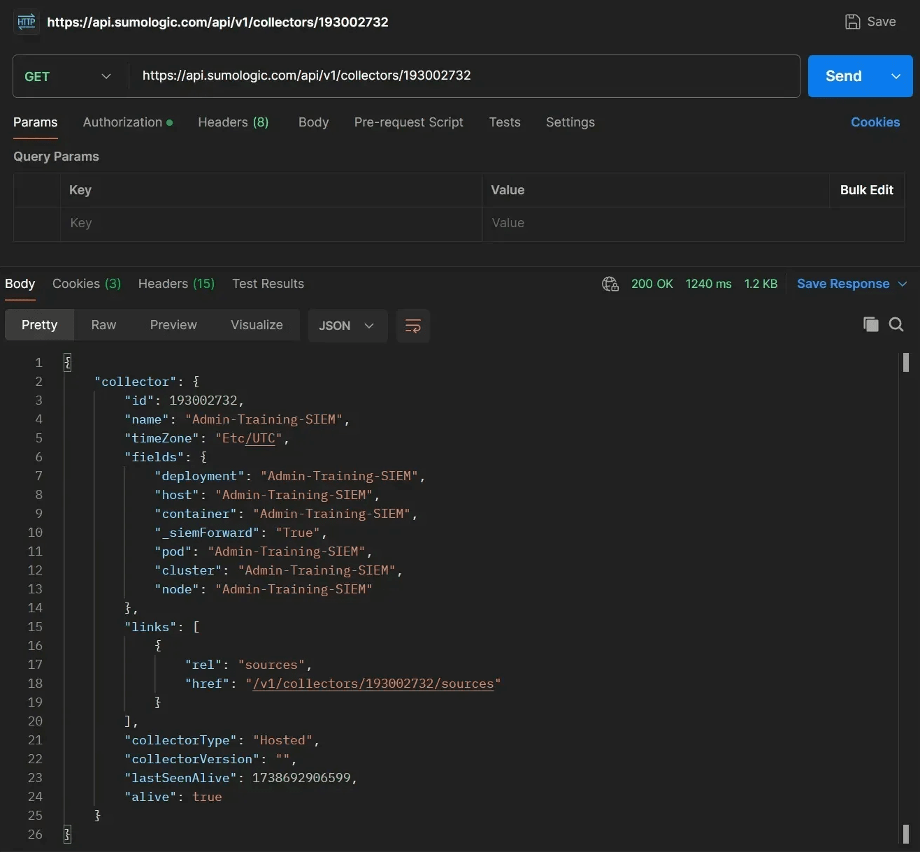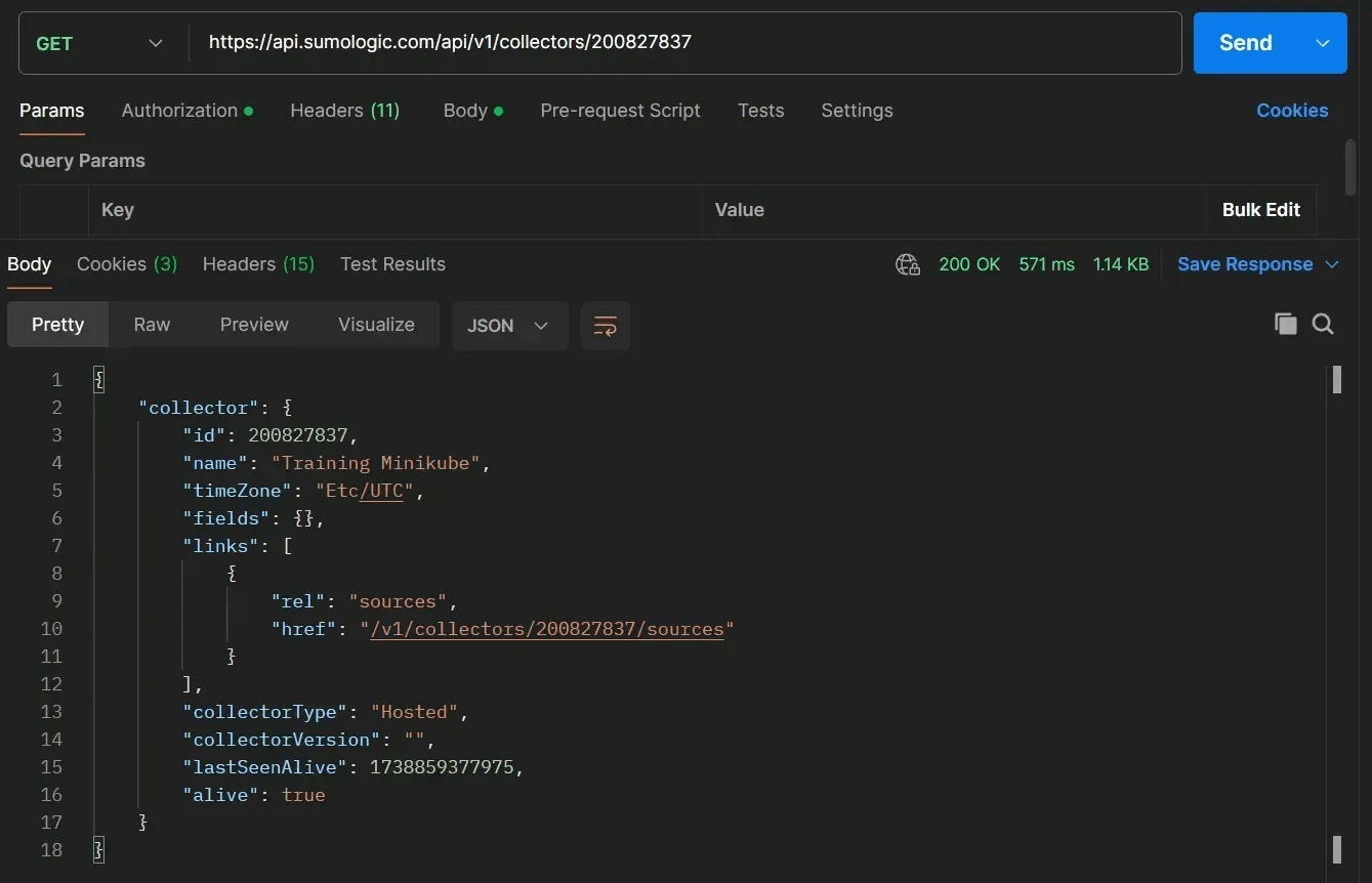 Note the first ID from your list or the sample ID shown above from the Sumo Logic environment. Create a new API call using the above URL format with the chosen ID in place of <collectorID> and run it.