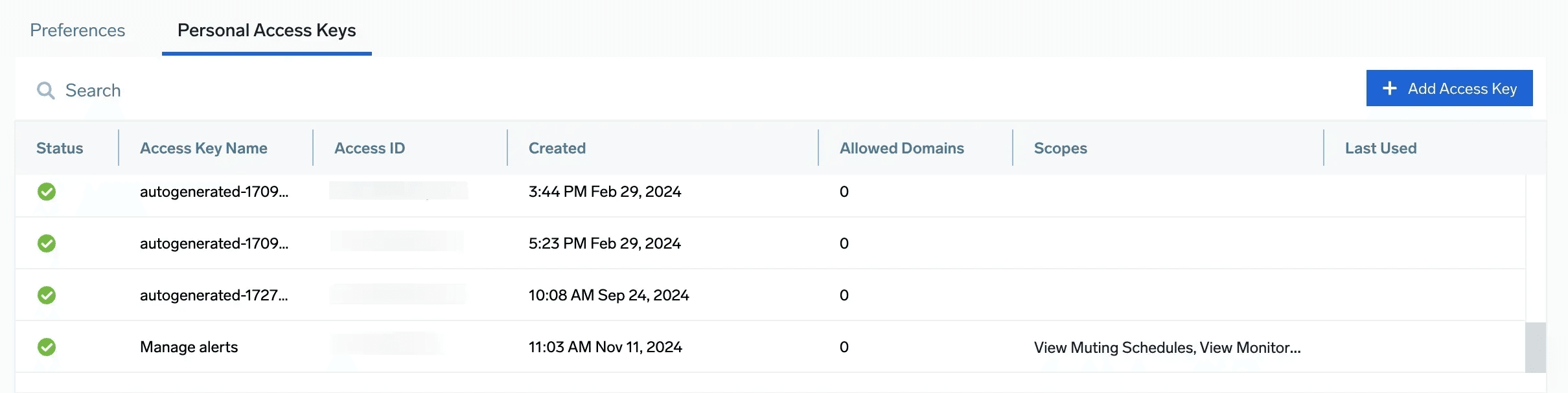 - On the Personal Access Keys tab, click +Add Access Key in the upper right.