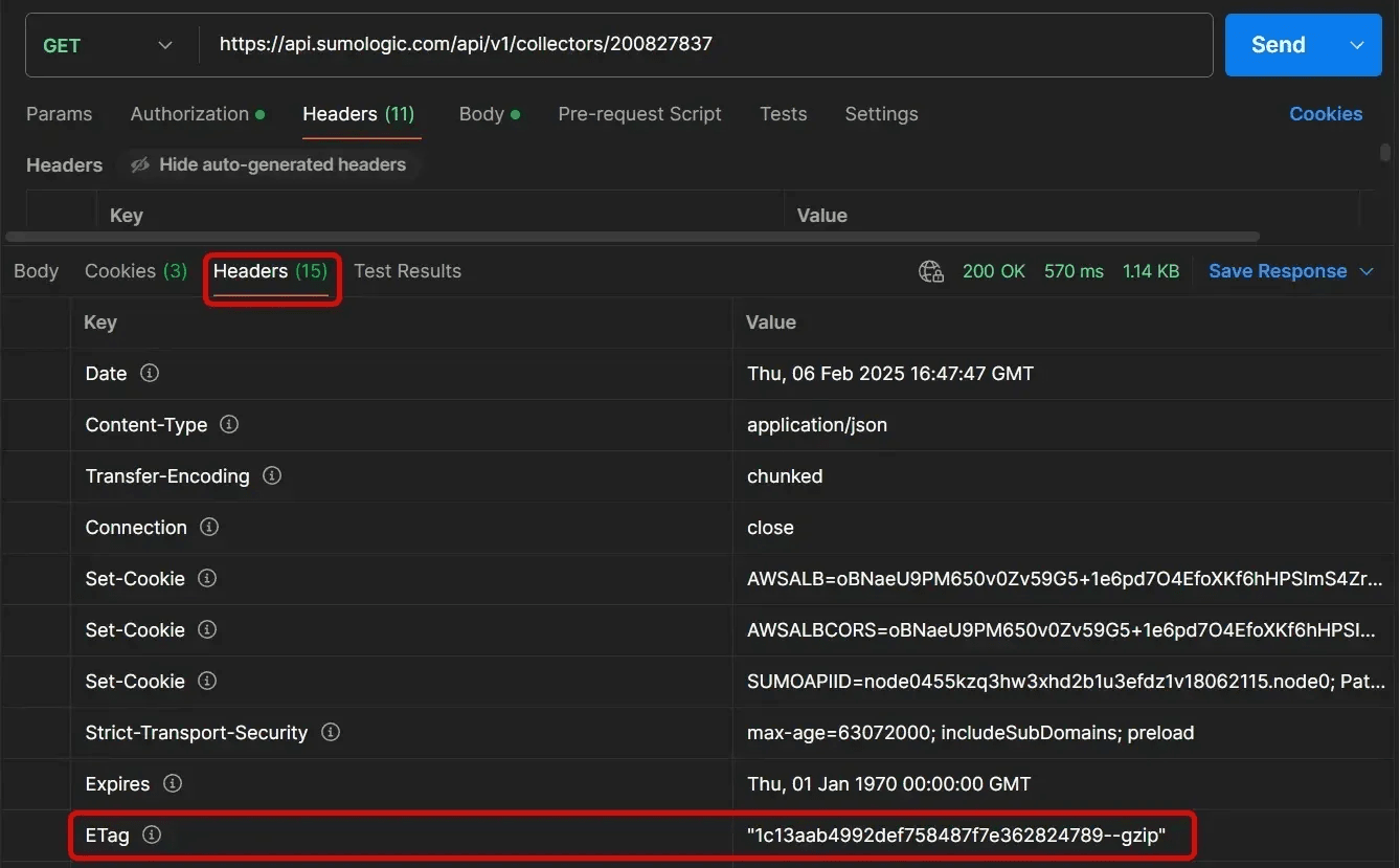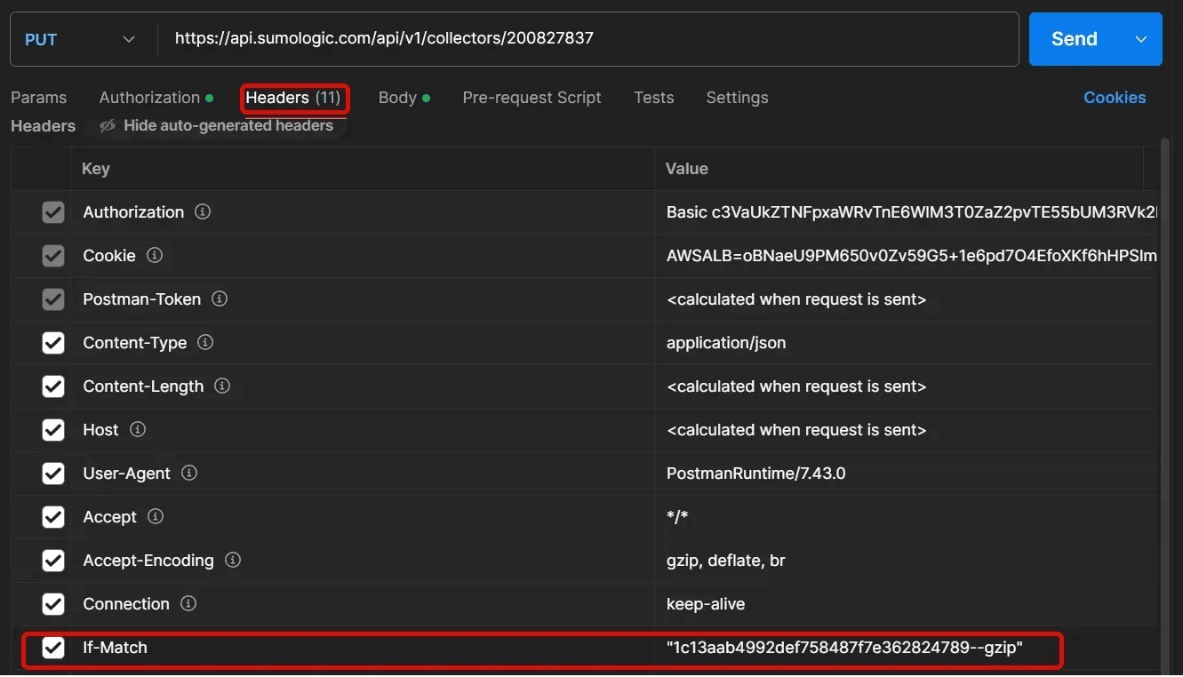 Many modern APIs (including Sumo Logic) provide protection against multiple sources changing object configurations at the same time. It is possible that during the brief period of time between when we executed our GET command to retrieve the current collector configuration and when we execute our PUT command to change the configuration, some other source has used the API or the website to change the collector configuration in other ways. The Sumo Logic API is configured so that you need to guarantee that the collector configuration has not changed in the interim before it will allow any new changes to be accepted.