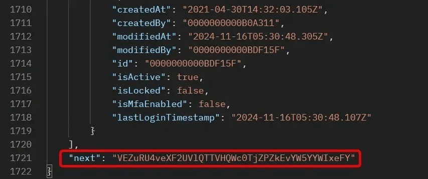 In the screenshot below, we are using the provided "next" token from page 1 to get page 2 of the users (users #101 - 200)