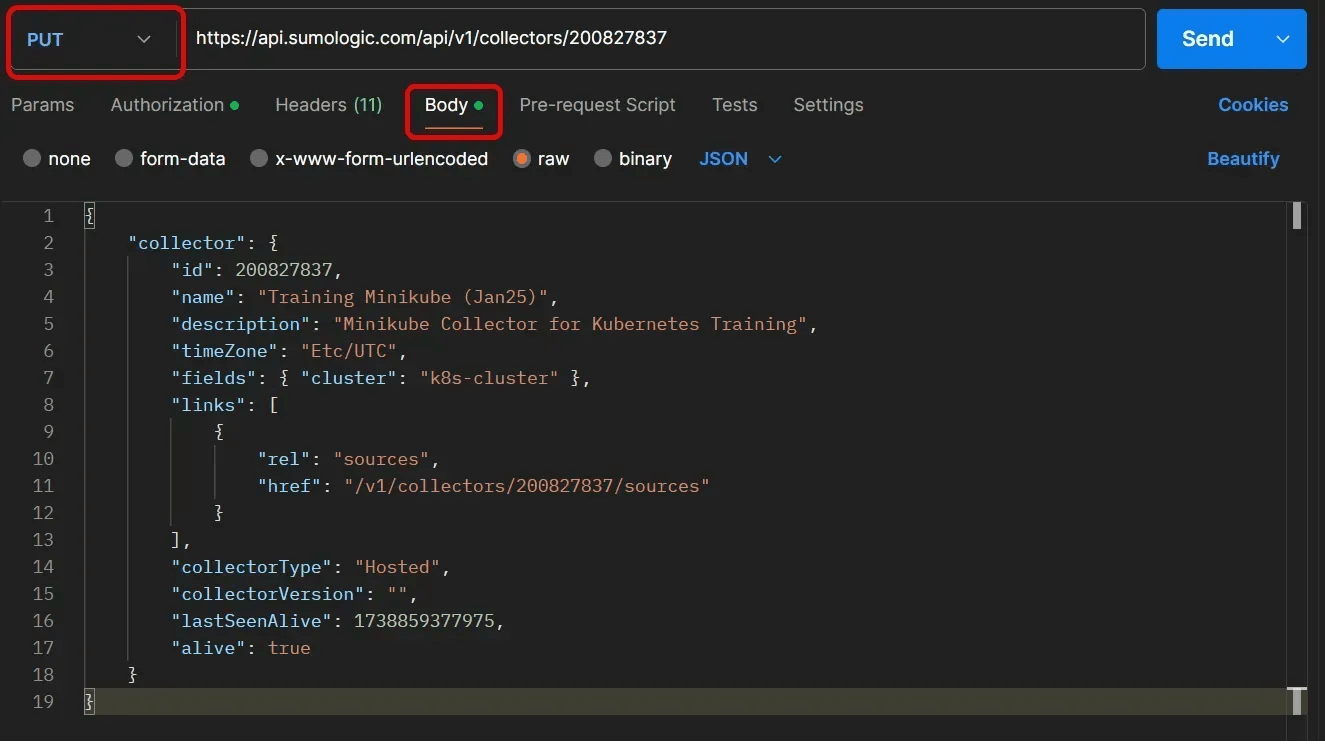 We'll need to provide in our HTTP request the new configuration for this collector object. We'll do this by copying the JSON from our text editor with our desired changes into the body of our request.