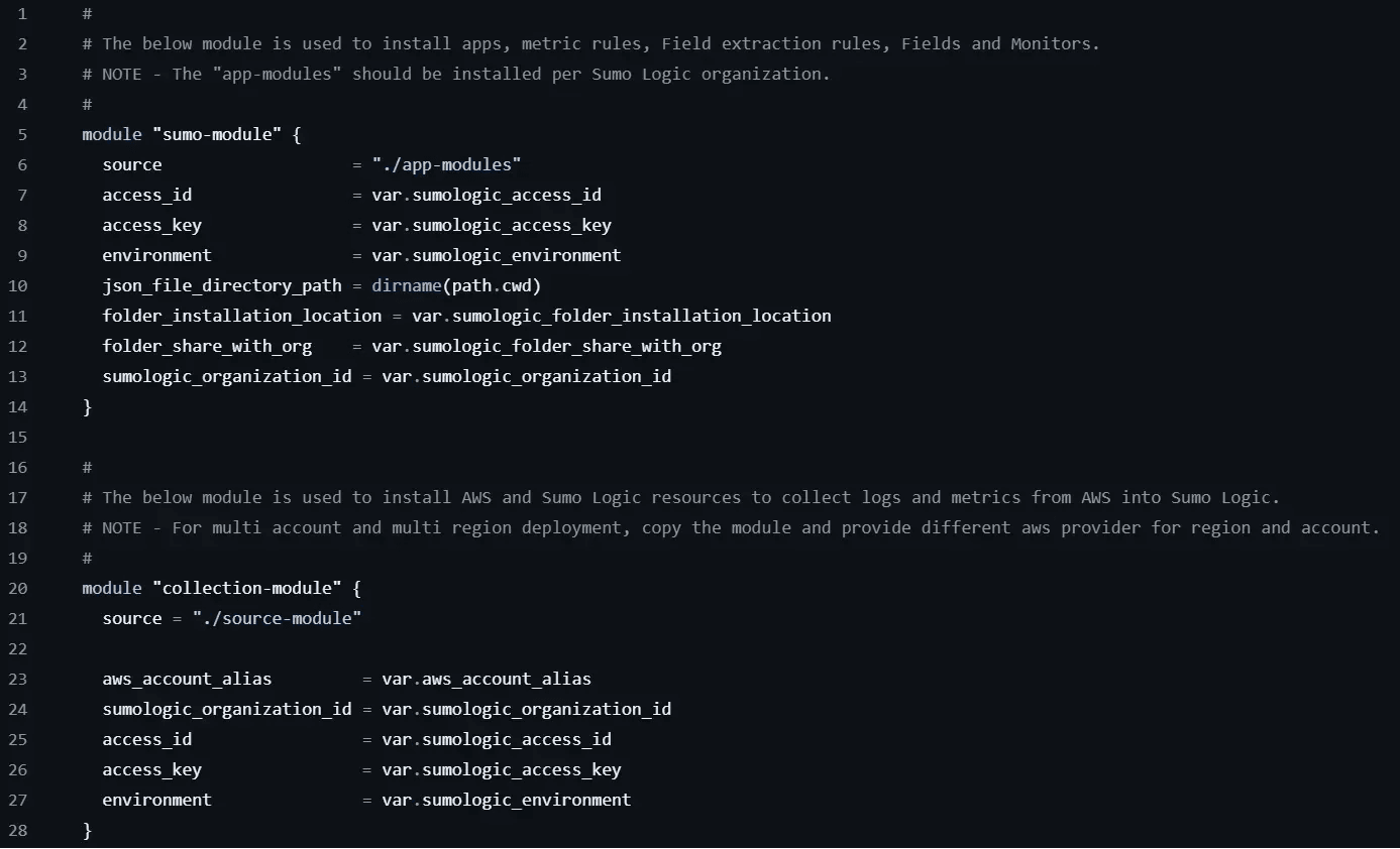 To illustrate how to use Terraform with Sumo Logic, we'll walk you through how to deploy the Sumo Logic AWS Observability Solution with a Terraform template. Sumo Logic has already established a Terraform template containing the basic script items needed to setup an AWS installation with the proper AWS and Sumo Logic resources and components.