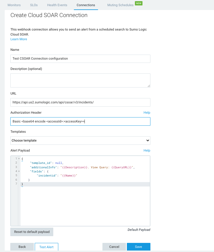 You can configure a webhook connection to allow you to send an alert from a scheduled search to Sumo Logic Cloud SOAR using an incident template.