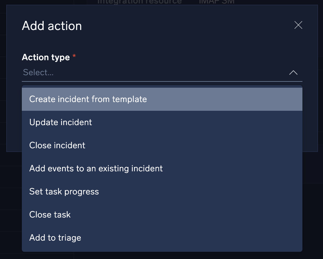 - Create incident from template. Specify what incident template to use, the incident owner, and incident ID format. This is the most common action.