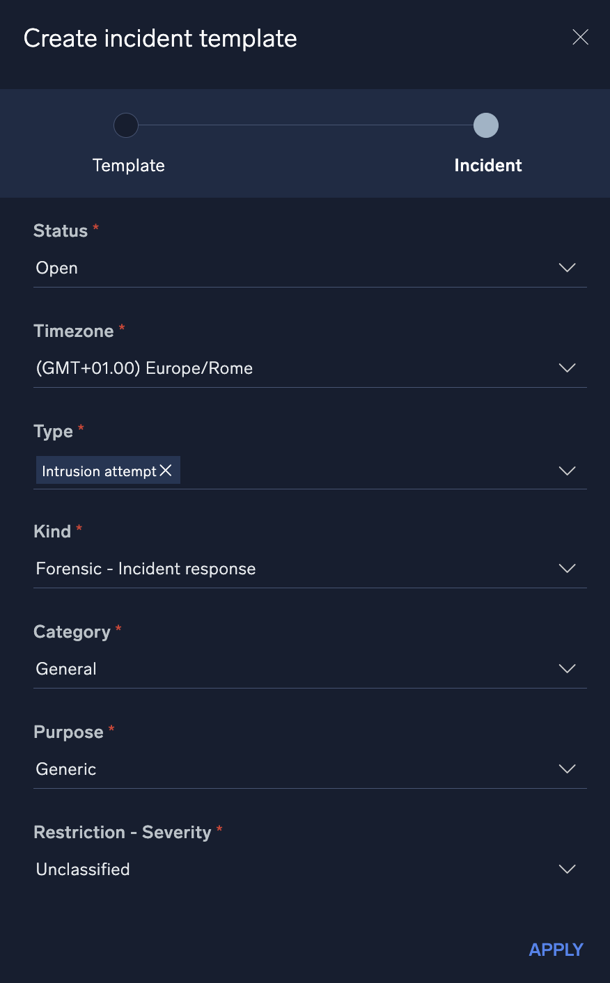 Incident templates define the way in which incidents will be created for a specific alert, incident type or event. They allow you to define a certain number of incident attributes (for example, incident type, severity, assignment, and any other default or custom incident parameters) that will automatically be set each time an incident is generated, based on the template. This may include type, classification, incident assignment, playbooks, knowledge base articles, or any other incident attribute. Since rules are created for generating incidents based on syslog messages, email, SIEM integrations, or other data sources, it is the incident templates that will define how the initial incident will be created.