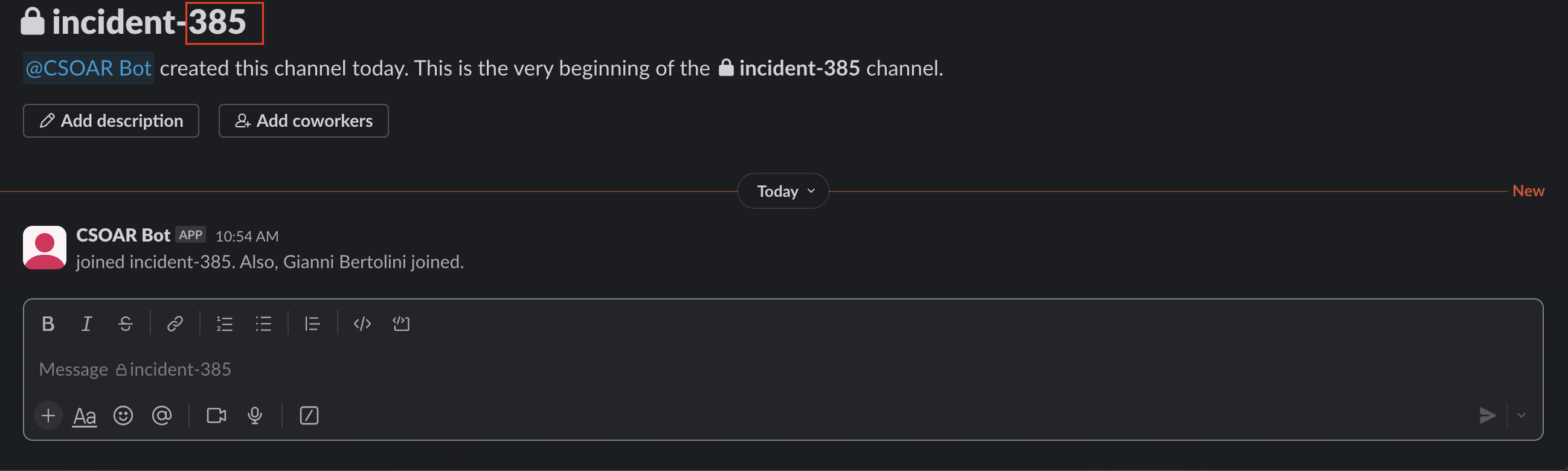 When an incident is created, a conversation channel will automatically be created within your Slack workspace, where the channel name will be formed like this: incident-incident_id. Furthermore, all users (owners, investigators, groups) who are part of the workspace will be added to the channel.