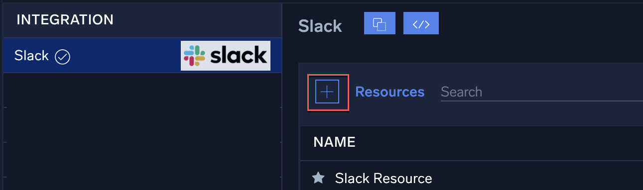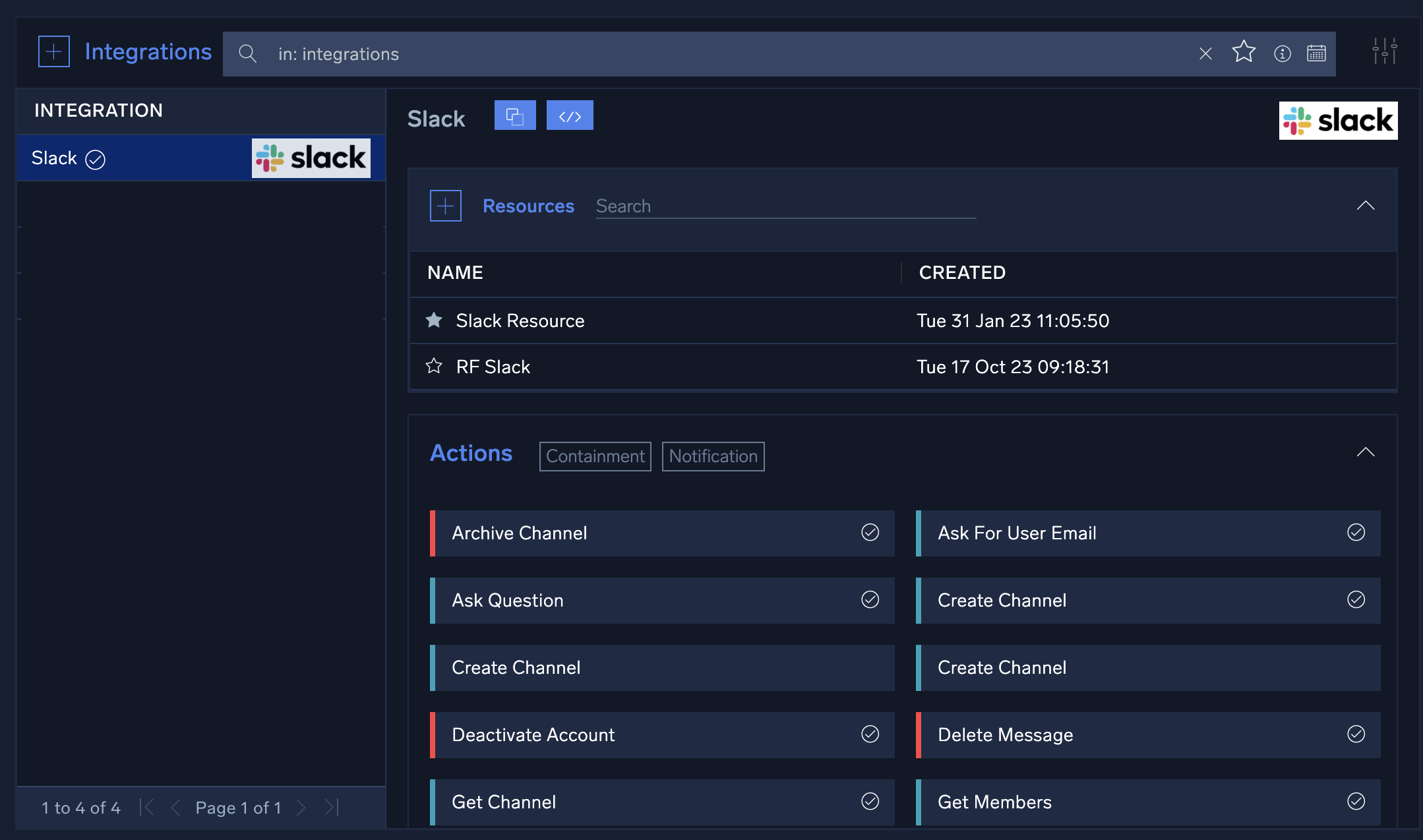 in the top right, select Automation, and then select Integrations in the left nav bar. - Select the Slack integration. The integration's resources appear.