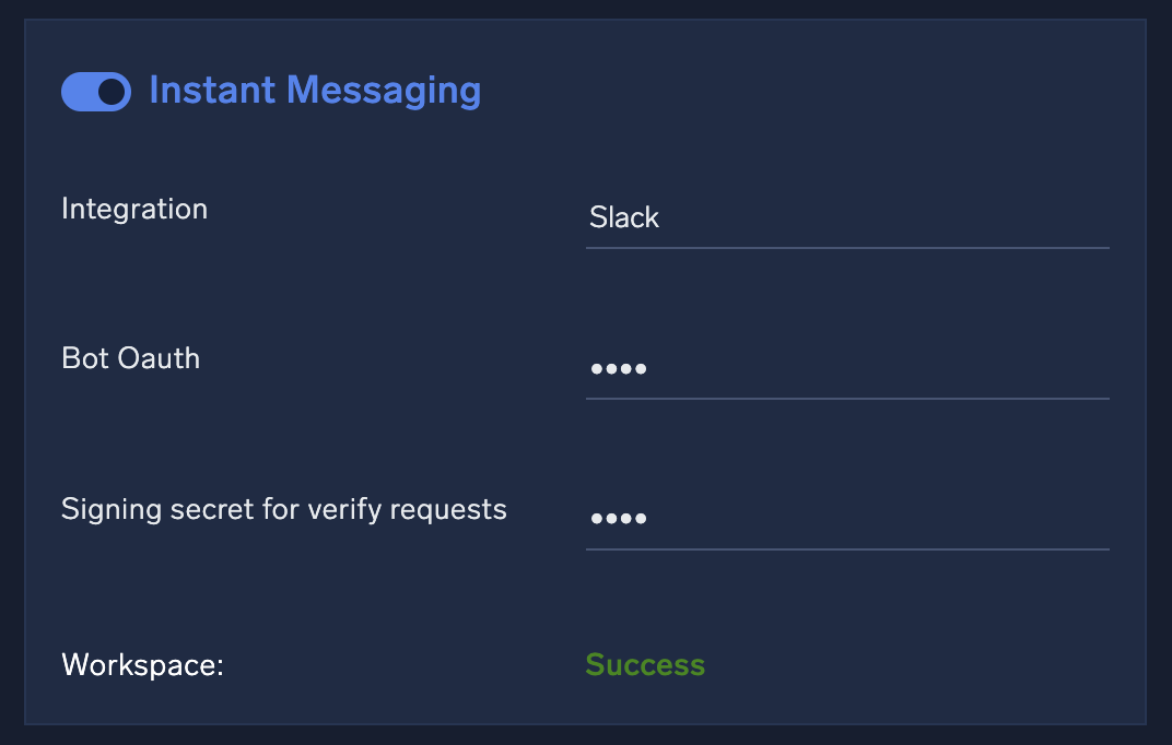 If your new resources are configured correctly, and Instant Messaging displays a "Success" message for the configured workspace, you can Use the Slack app in User Choice.
