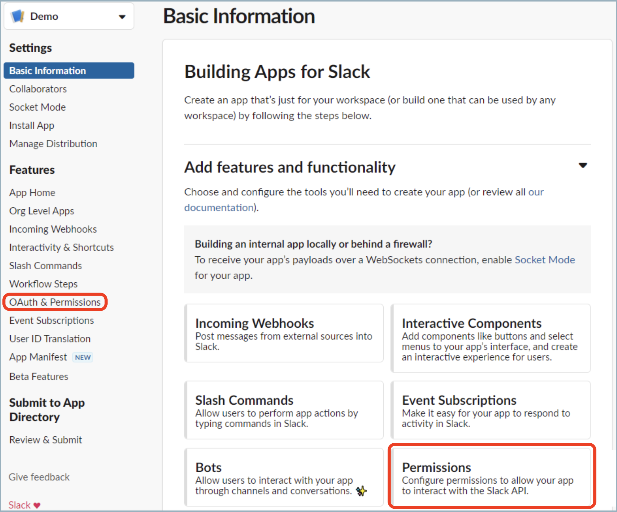 - Click Permissions, or from the left nav bar, click OAuth & Permissions.