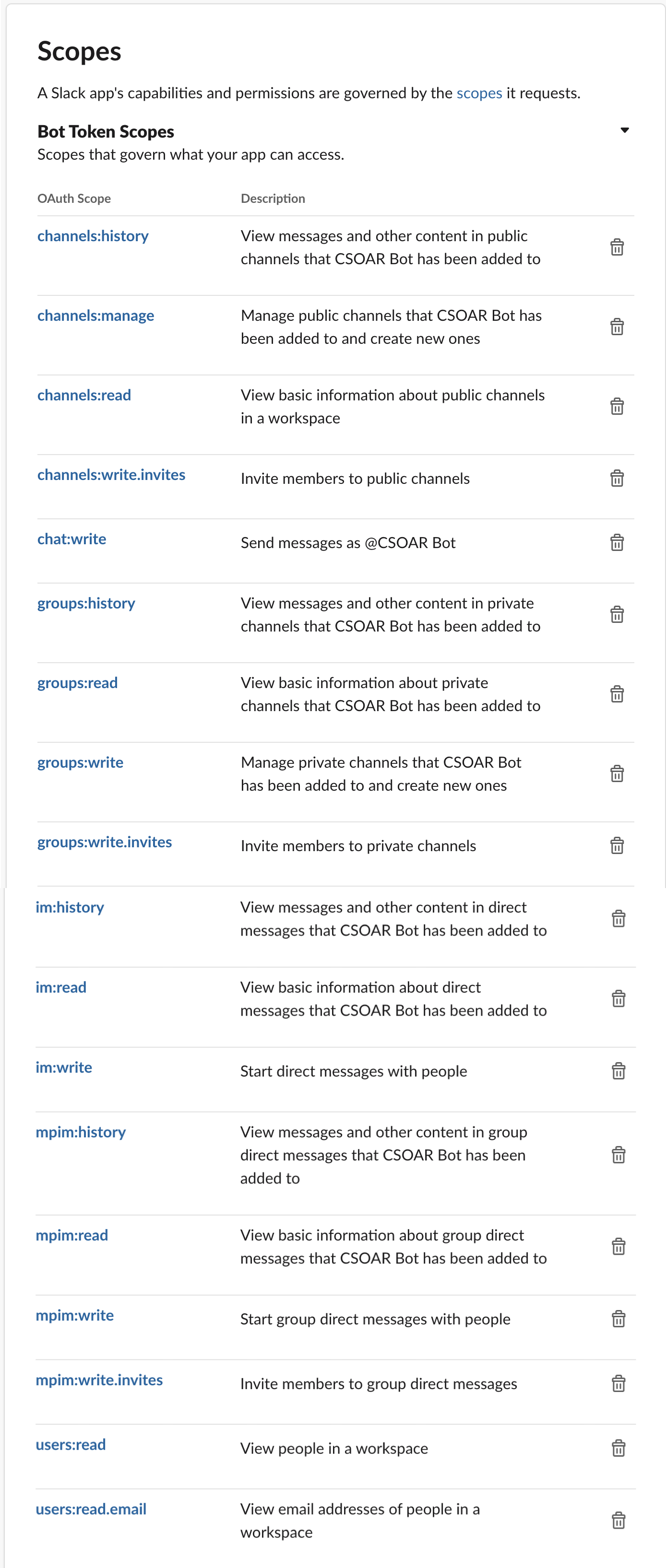 channels:history. View messages and other content in public channels that your Slack app has been added to.groups:history. View messages and other content in private channels that your Slack app has been added to.im:history. View messages and other content in direct messages that your Slack app has been added to.mpim:history. View messages and other content in group direct messages that your Slack app has been added to.