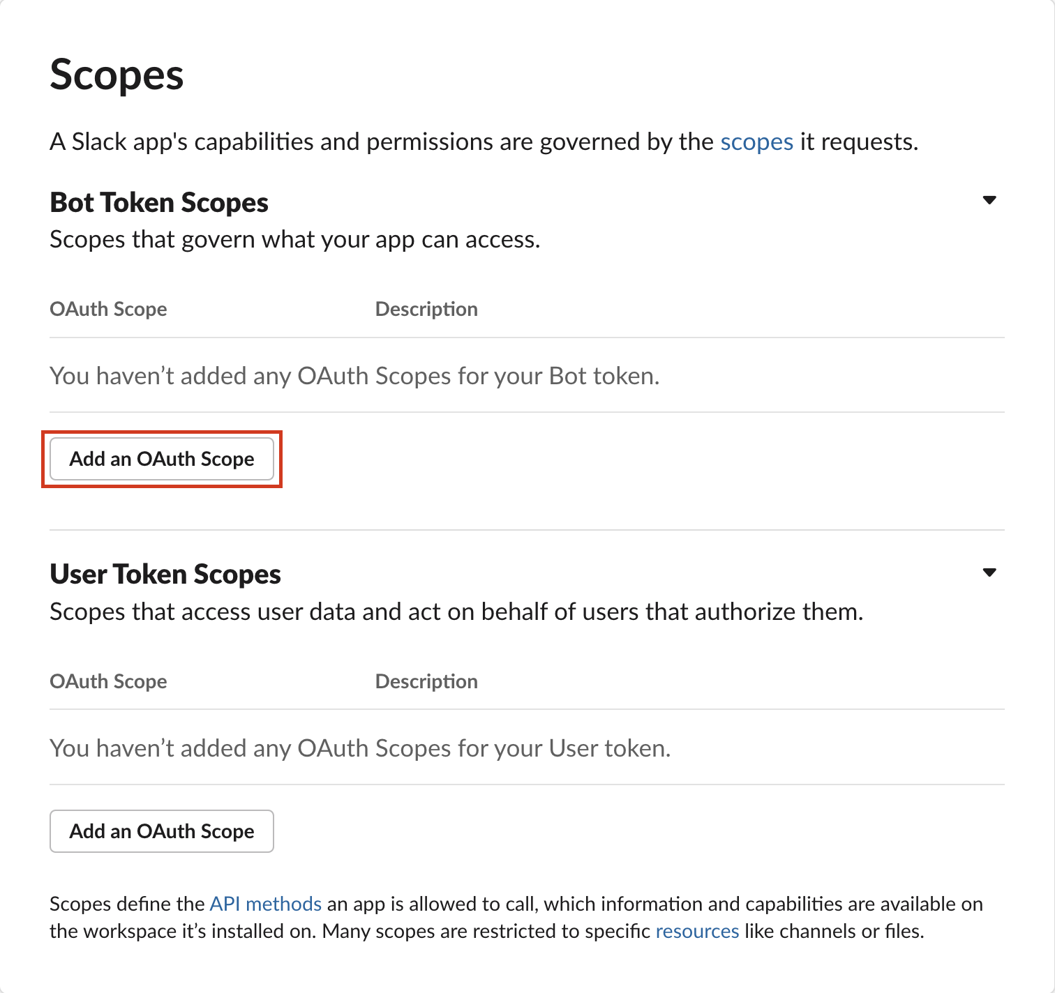 You must add permissions for the Bot Token. Bot tokens let your app act independently. - Click Add an OAuth Scope under Bot Token Scopes.