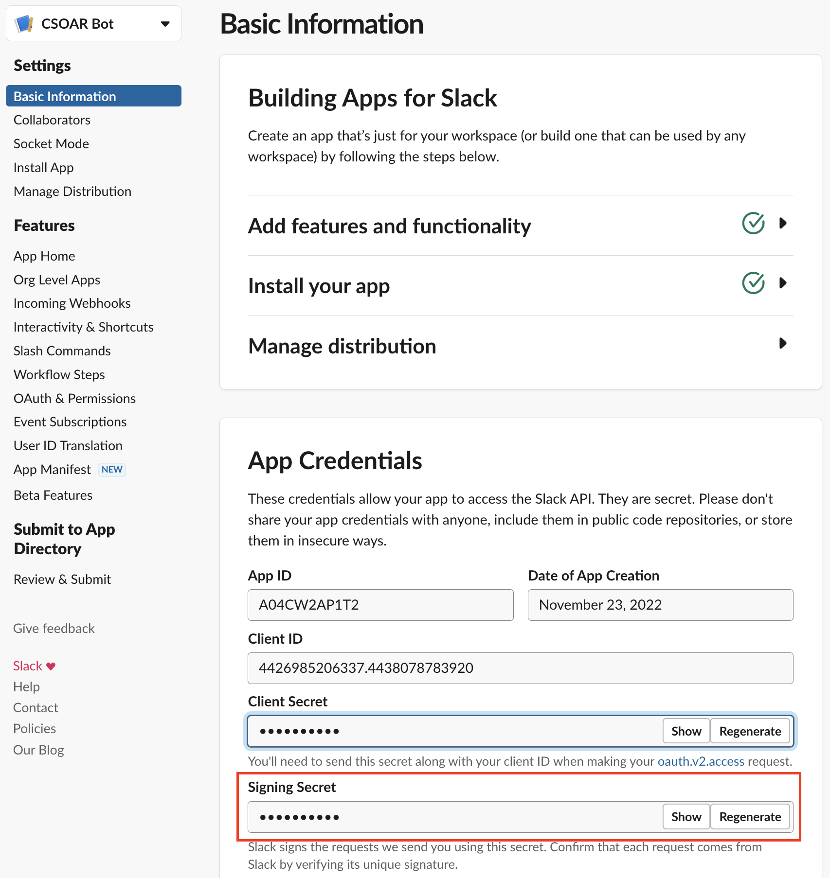 - Installation generates a Bot User OAuth Token and a Signing Secret. Copy the tokens and keep them in a secure location for use in the next step.