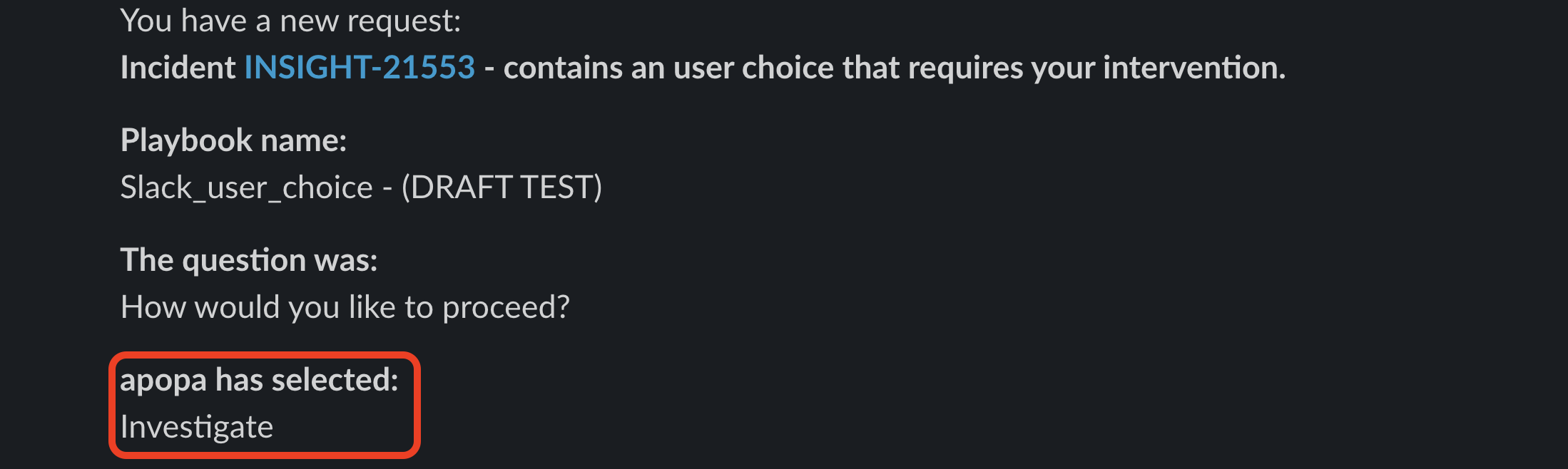 - After a recipient chooses one of the available options, the playbook flow will continue and a message will inform the user or the group about the choice made.