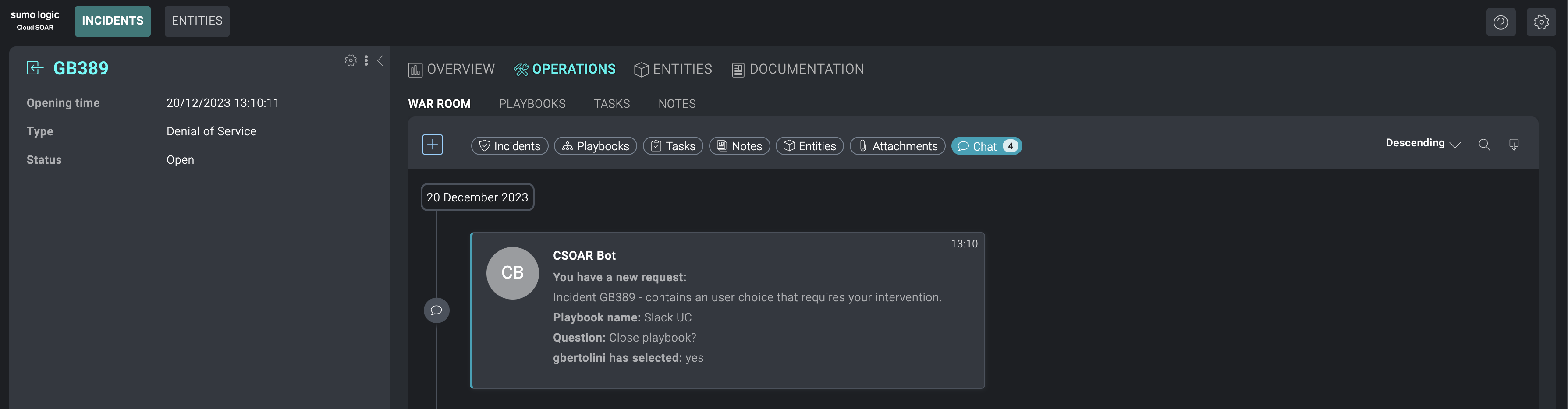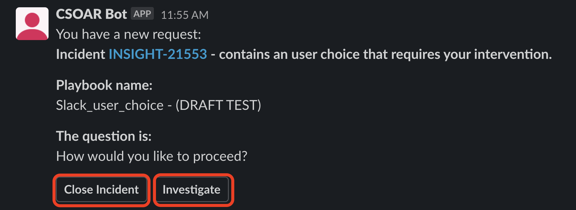 In this case, the Authorizer set is just a user. If a group is chosen, a message will be sent directly from the CSOAR Bot to every available user. If a user is not selected, and the playbook is inside an incident, the message will be sent within the relevant channel in the Slack workspace, and all the users within it will be authorized to choose one of the User Choice available options. - When the playbook flow reaches the User Choice, the user will receive a message containing the reference to the incident, the playbook name, and the question set for the User Choice.