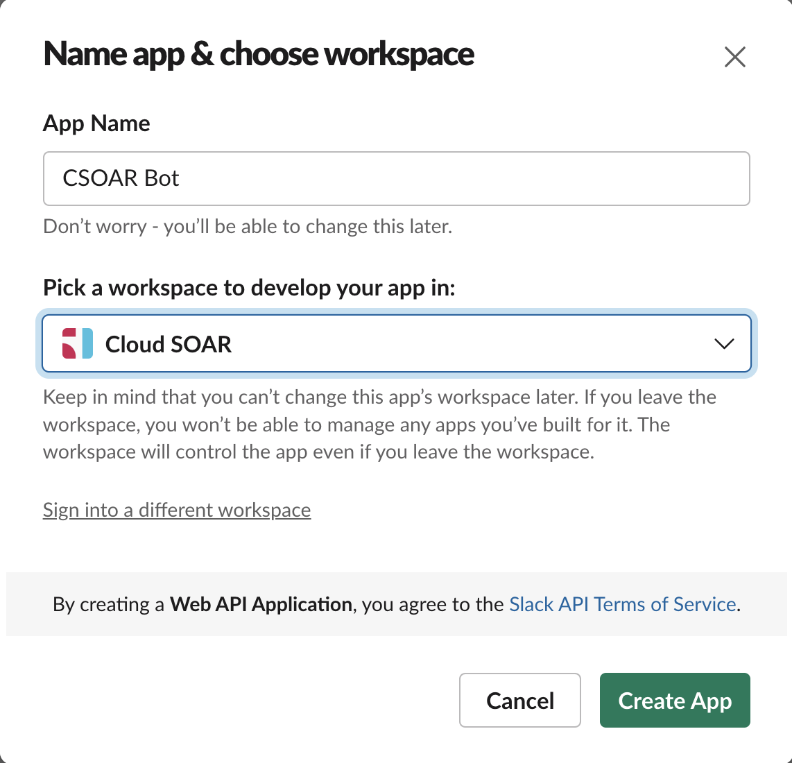- Enter "CSOAR Bot" as the app name and select the workspace where you wish to install it.