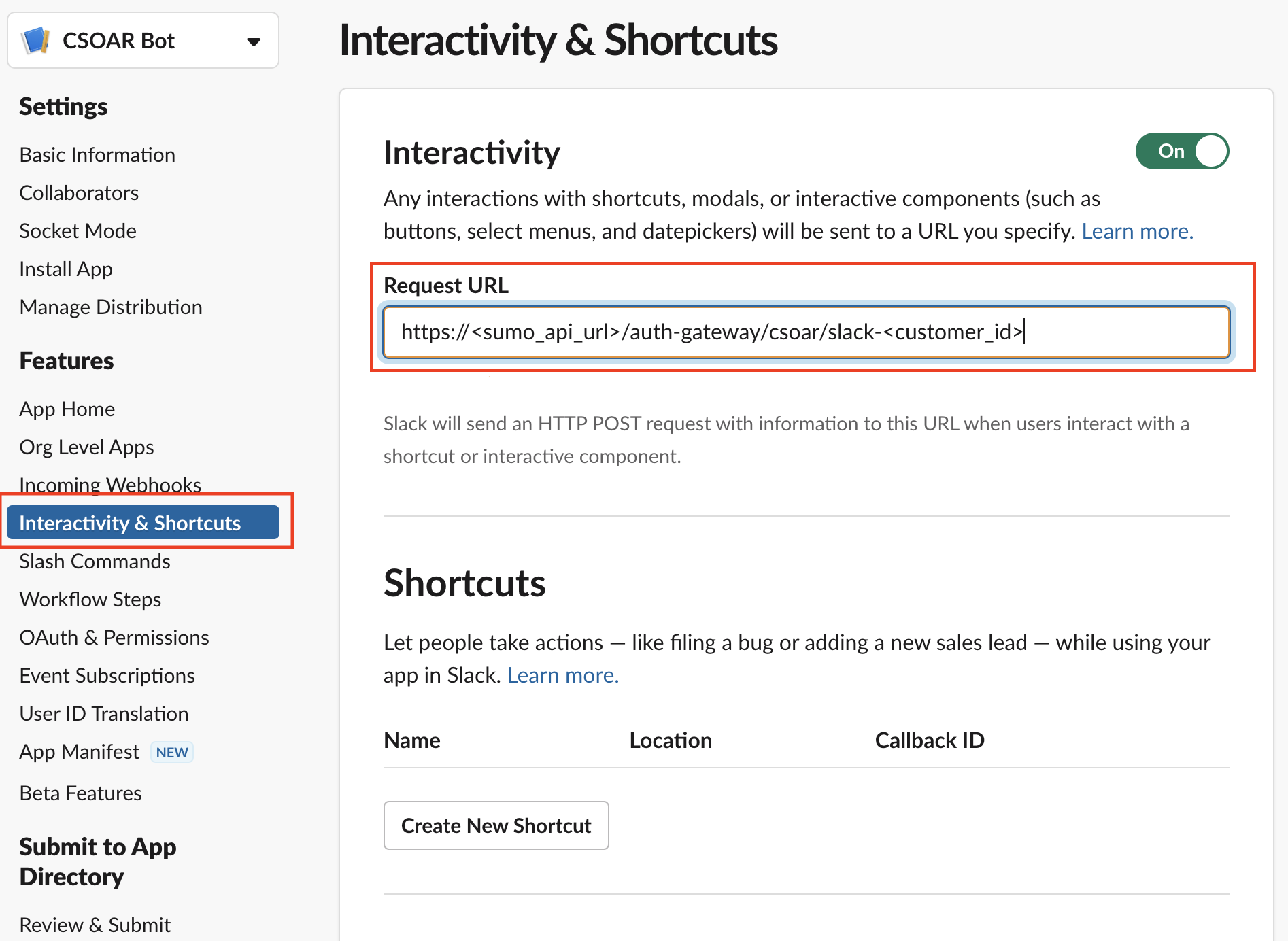 - Place your instance URL in the Interactivity & Shortcuts page.