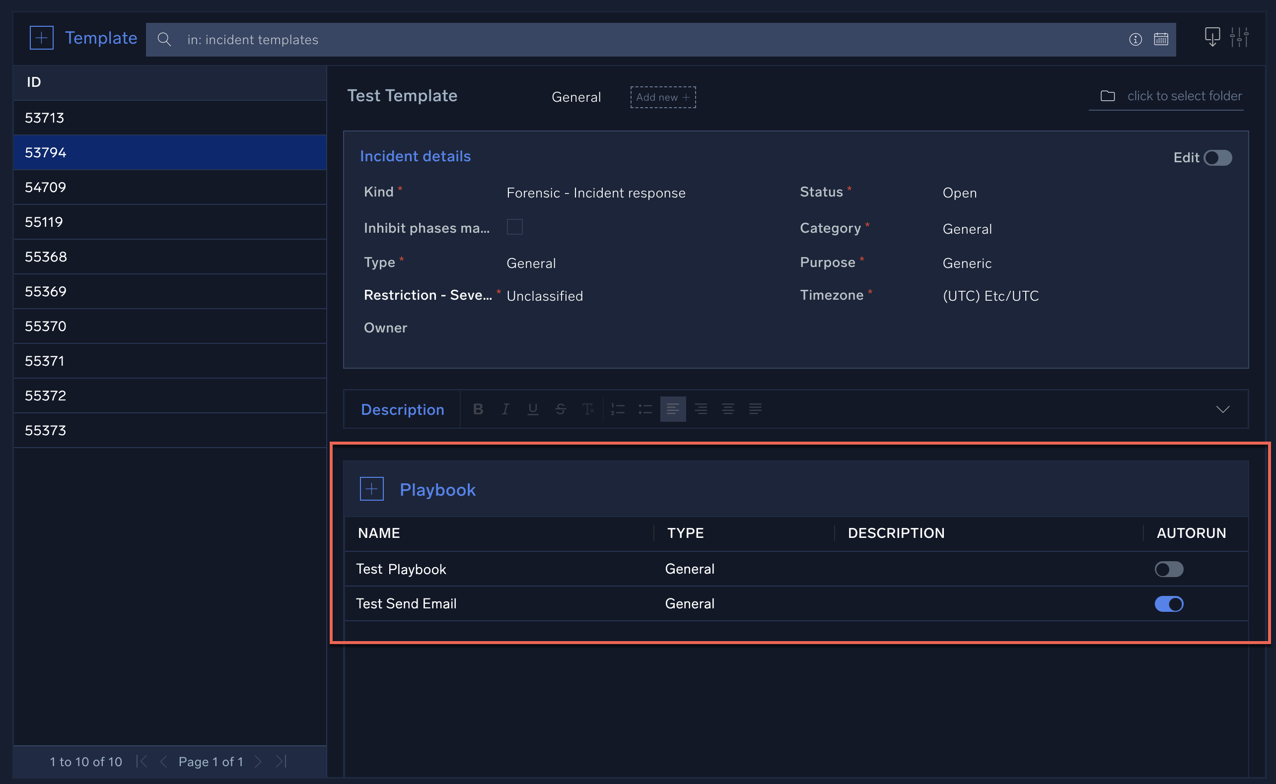 - Create an incident template to be assigned to incidents. When you create the template, add the playbook to the template and select Autorun to run the playbook when the incident is created, or deselect if you want to manually run the playbook from the incident.