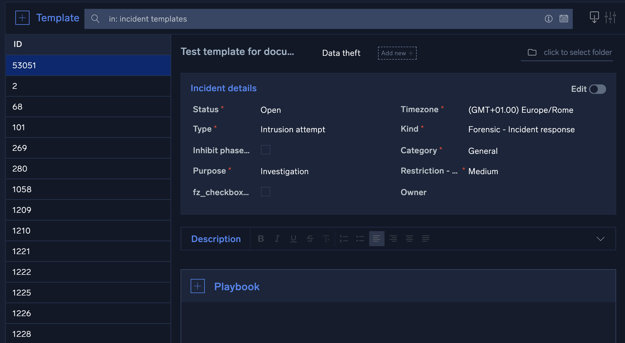 - Category. Enter a category for this template. For example, suppose we're building a template for a DLP incident. We might enter a category named Data Theft, but we can enter anything we want that will help us group incident templates in the future. You can customize this field to fit your environment, as well as all other fields in Cloud SOAR (see Custom fields).