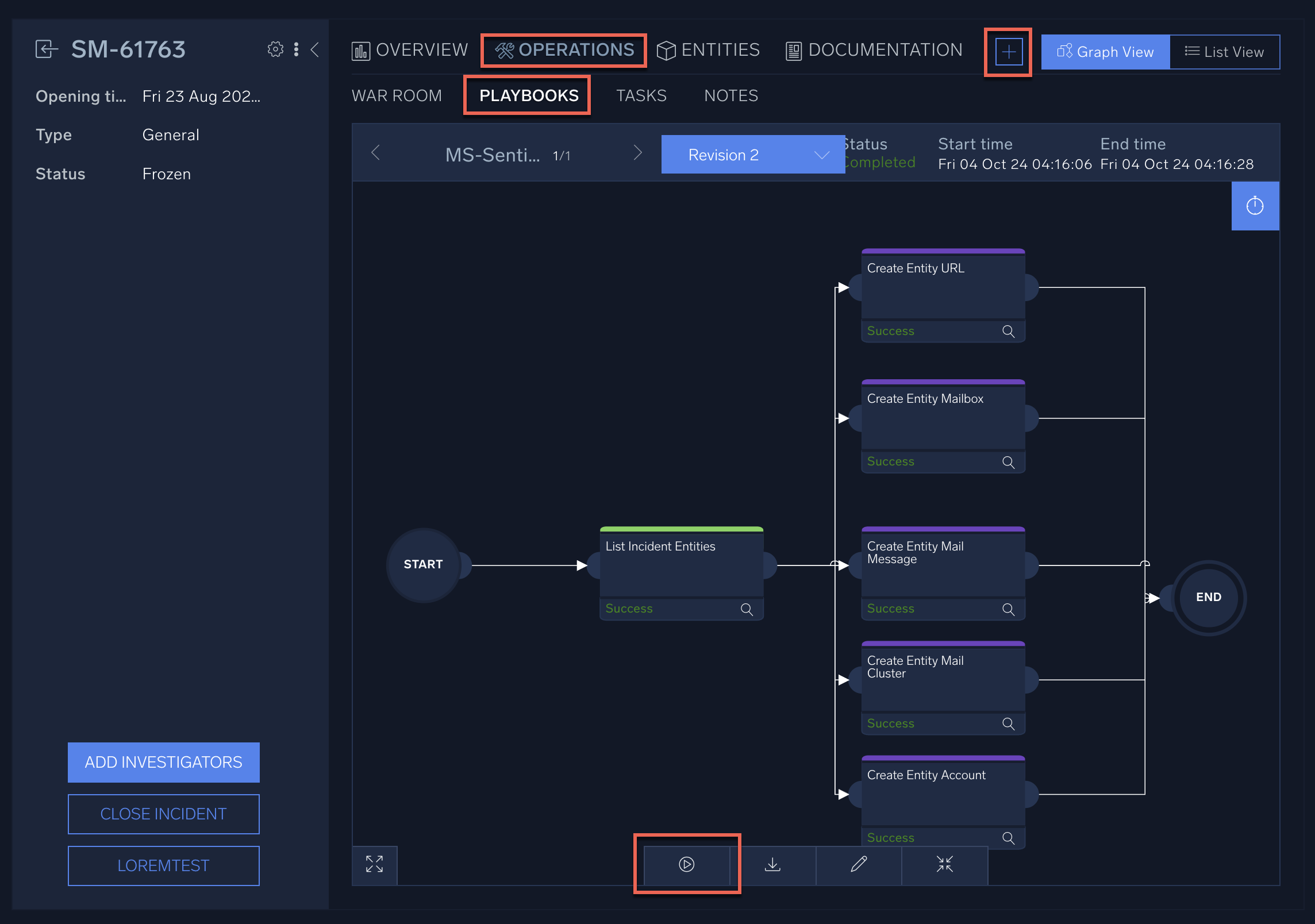- Within an incident, select Operations > Playbooks to see the playbooks assigned to the incident.
