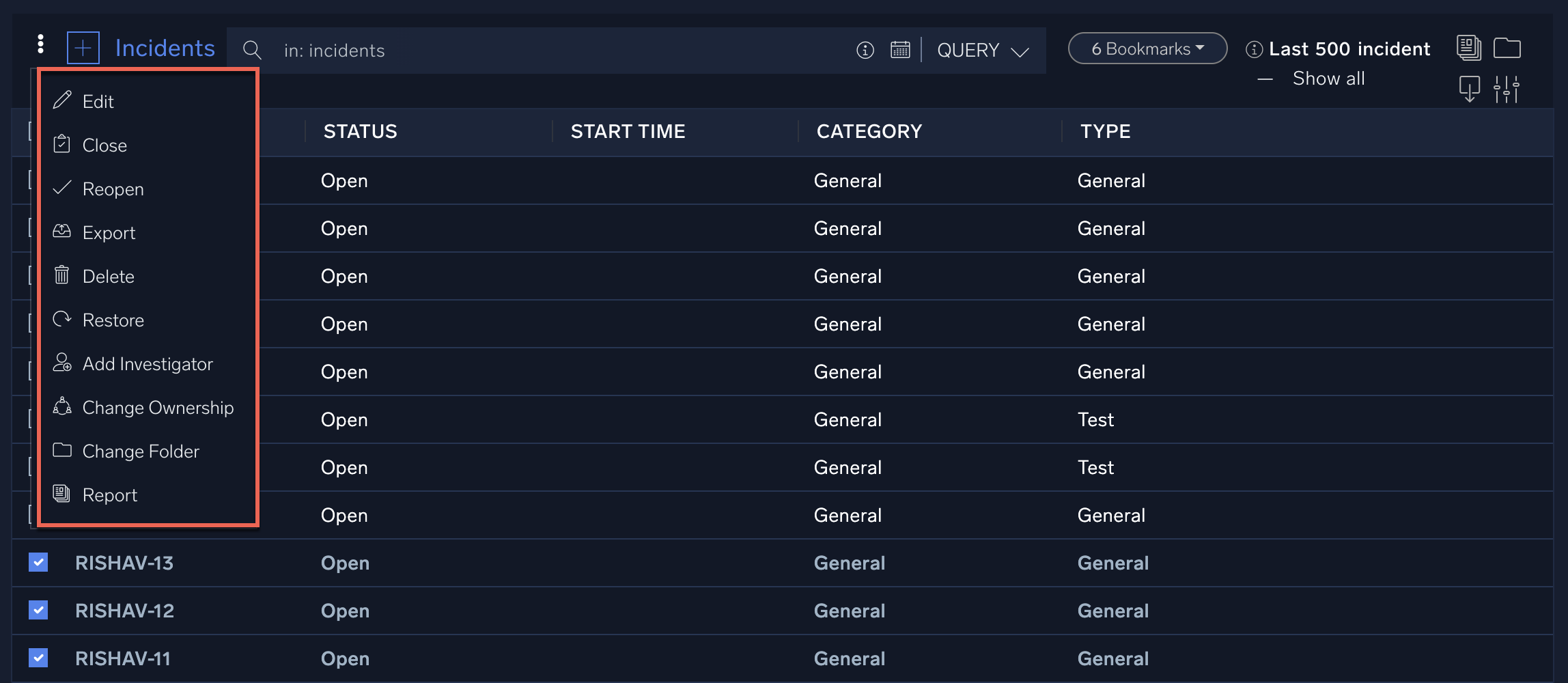 Bulk actions may be performed on any incidents in the incidents list. To perform bulk actions on incidents, check the incidents you wish to perform the bulk actions on, then click the three-dot kebab menu in the upper left-hand corner of the screen and select the appropriate bulk action from the dropdown menu.