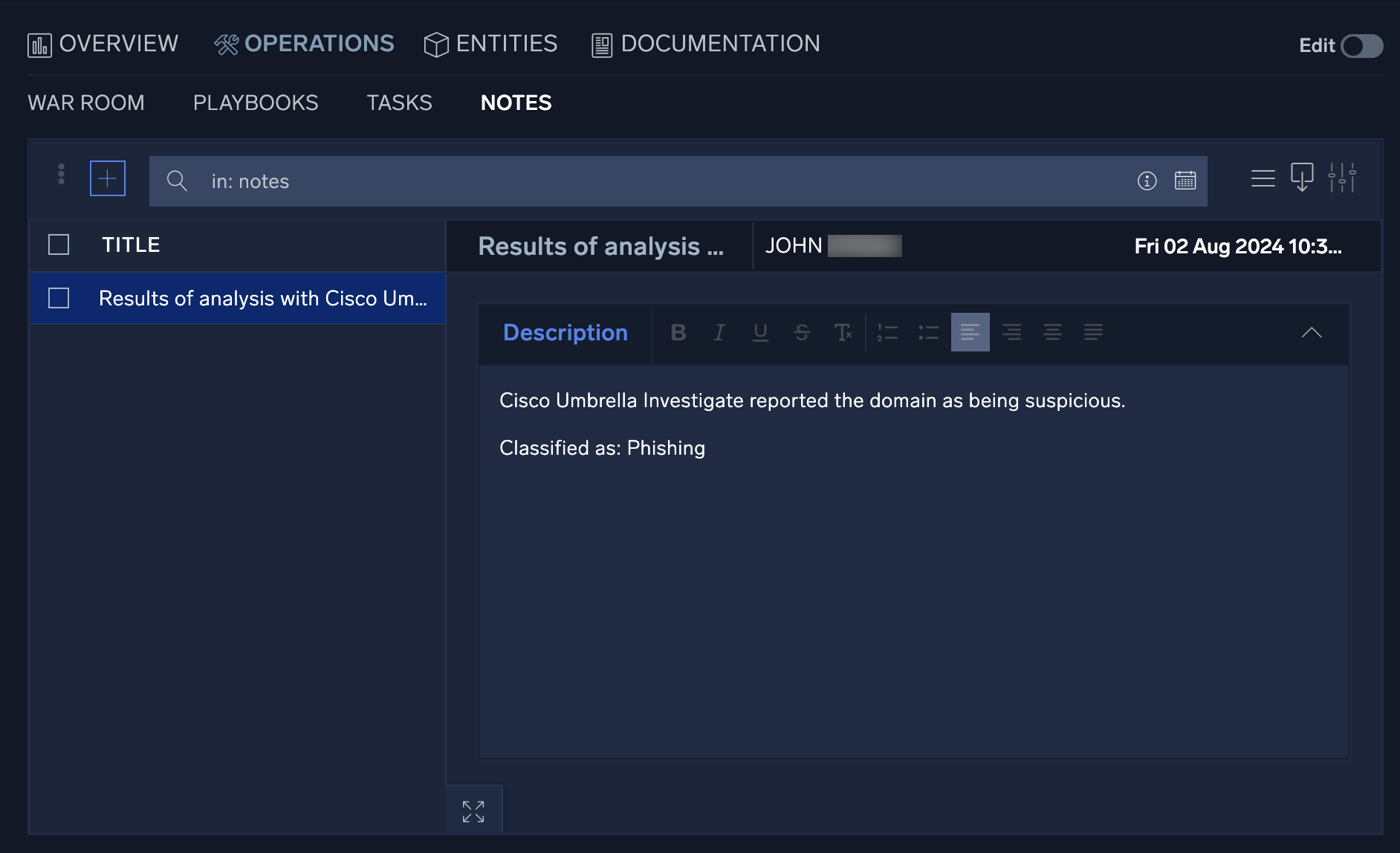 - Lock: Lock the entity to prevent any actions from being taken on it. This may be useful if you want to ensure that no enrichment actions are taken on attacker-controlled infrastructure or that an entity is not accidentally blocked.