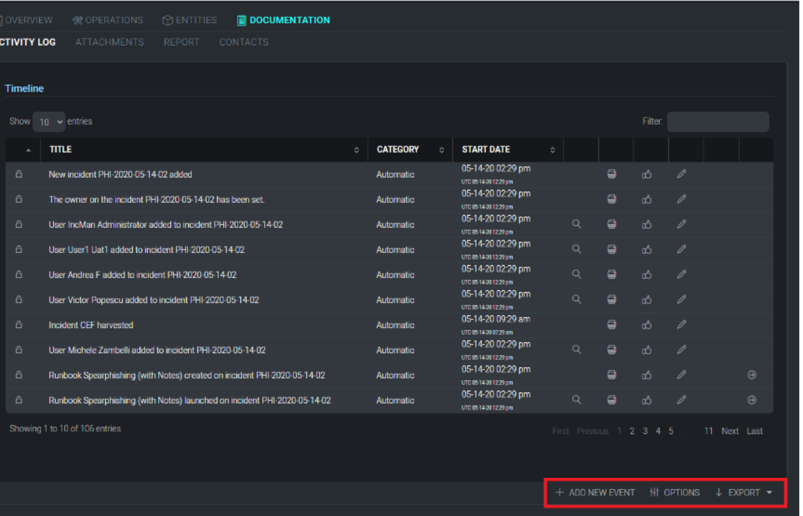 Cloud SOAR records a detailed audit log of all activity that is performed during an incident. A timeline of incident activity can be viewed in the incident Timeline section. Each incident has its own timeline and the events are classified under two categories: automatic if generated automatically by the system, or manual when created by the user.