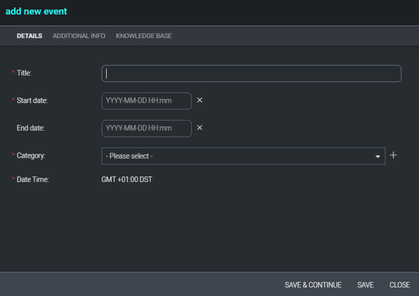 A new configuration box will be displayed. Title the event and choose what category the event falls into. (Please note, these categories can be edited under the Custom Fields section). Add any additional information necessary and associate an existing knowledge base article where applicable.