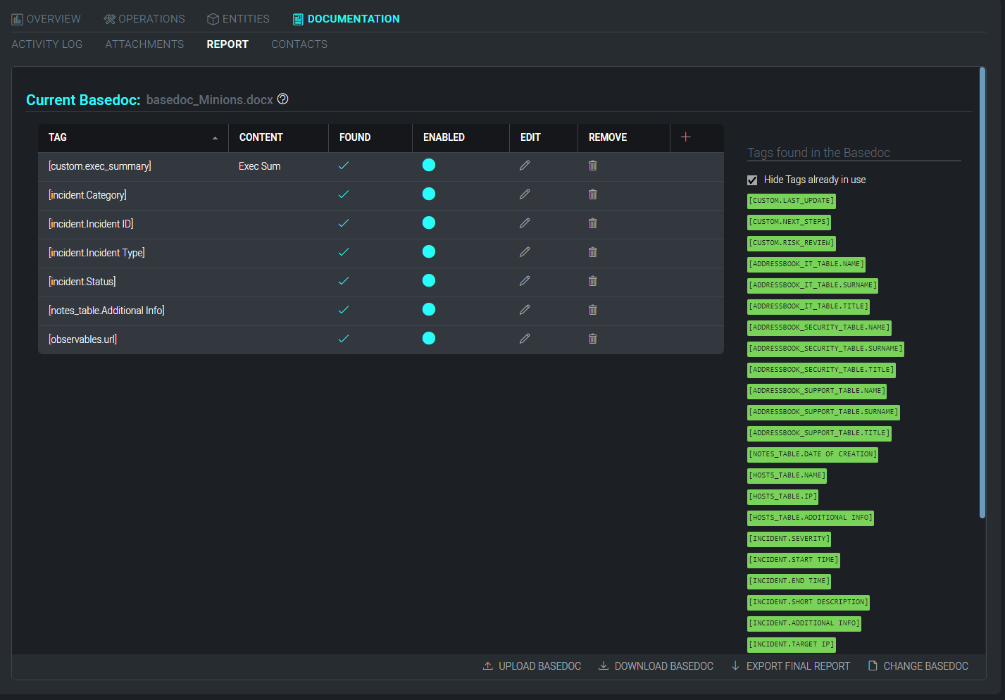 To add a new basedoc, click Upload Basedoc and select the template to use and click Save. Once the document has been uploaded users can choose which sections or tags to use in the report. These tags act as placeholders which will be filled in with the incident's details each time an incident report is executed.