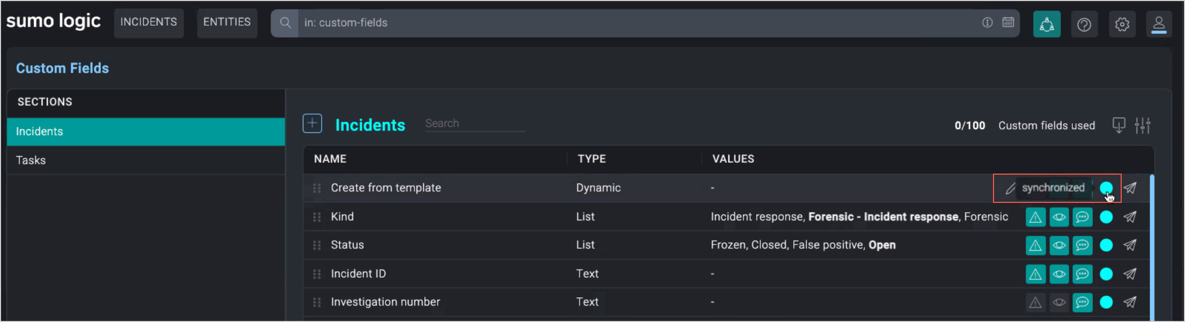 The screenshots below each show a list of Custom Fields for Incidents. This page is very similar to the equivalent page in a standard Cloud SOAR instance, but note the addition of two icons at the right side of each row. The circular icon is the Synchronized indicator. The arrow is the Push Field option.