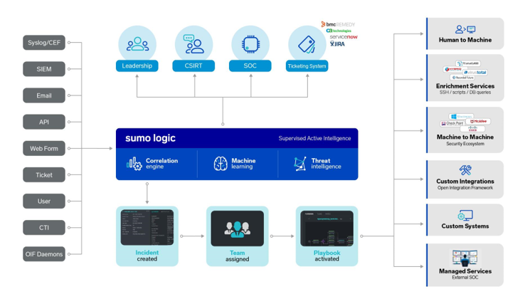 Sumo Logic Cloud SOAR provides Security Operations and Automation Incident Response Platform to facilitate and expedite timely management of Incident Response with a rich library of customizable playbooks for different threats and use cases of incident response scenarios expediting and automating response time to incident response events.