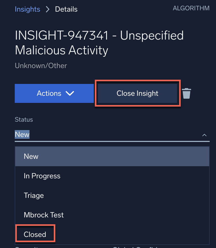 - After navigating to an insight, you can close it by either clicking the Close Insight button or by selecting Closed from the Status pulldown.