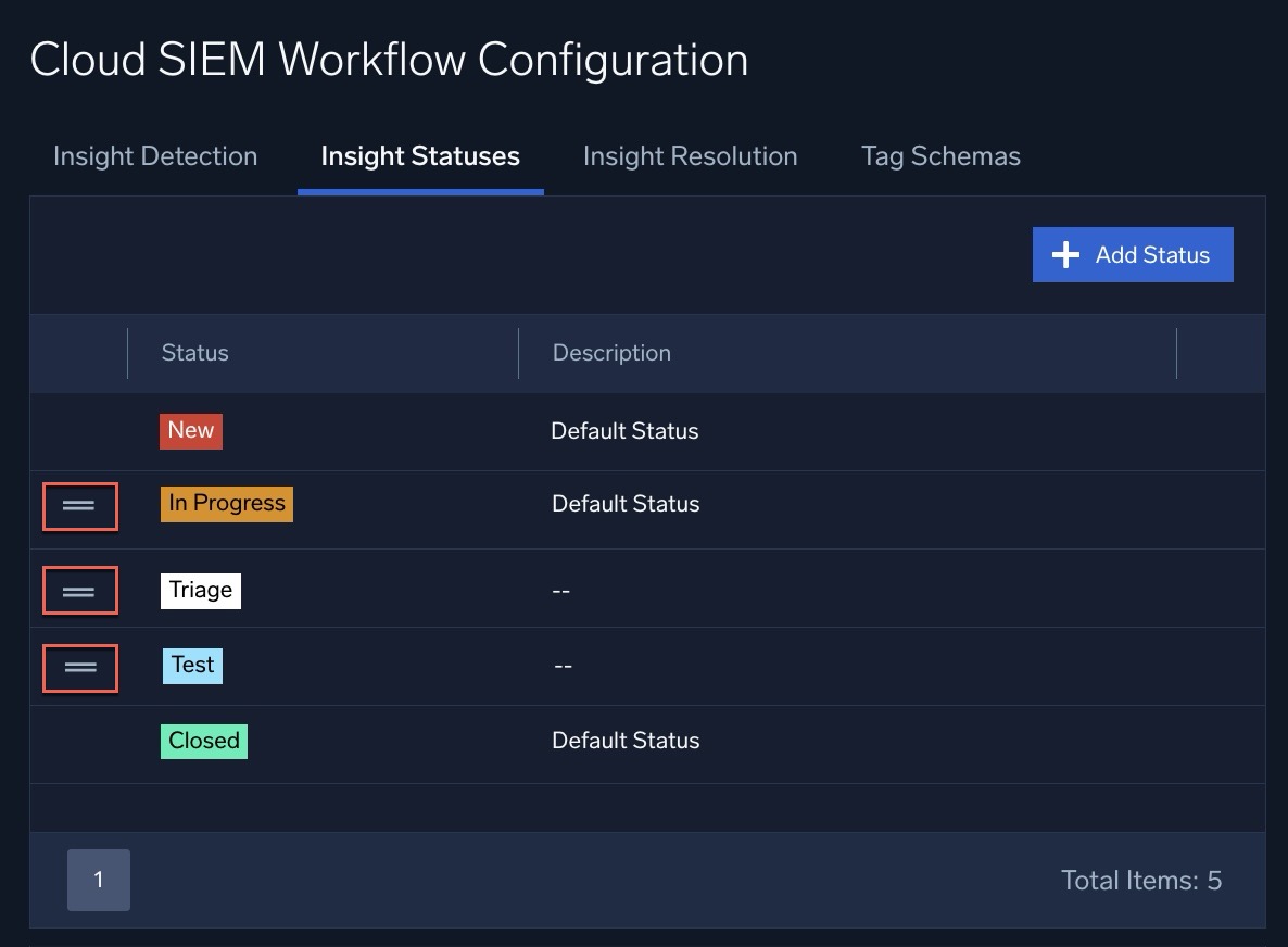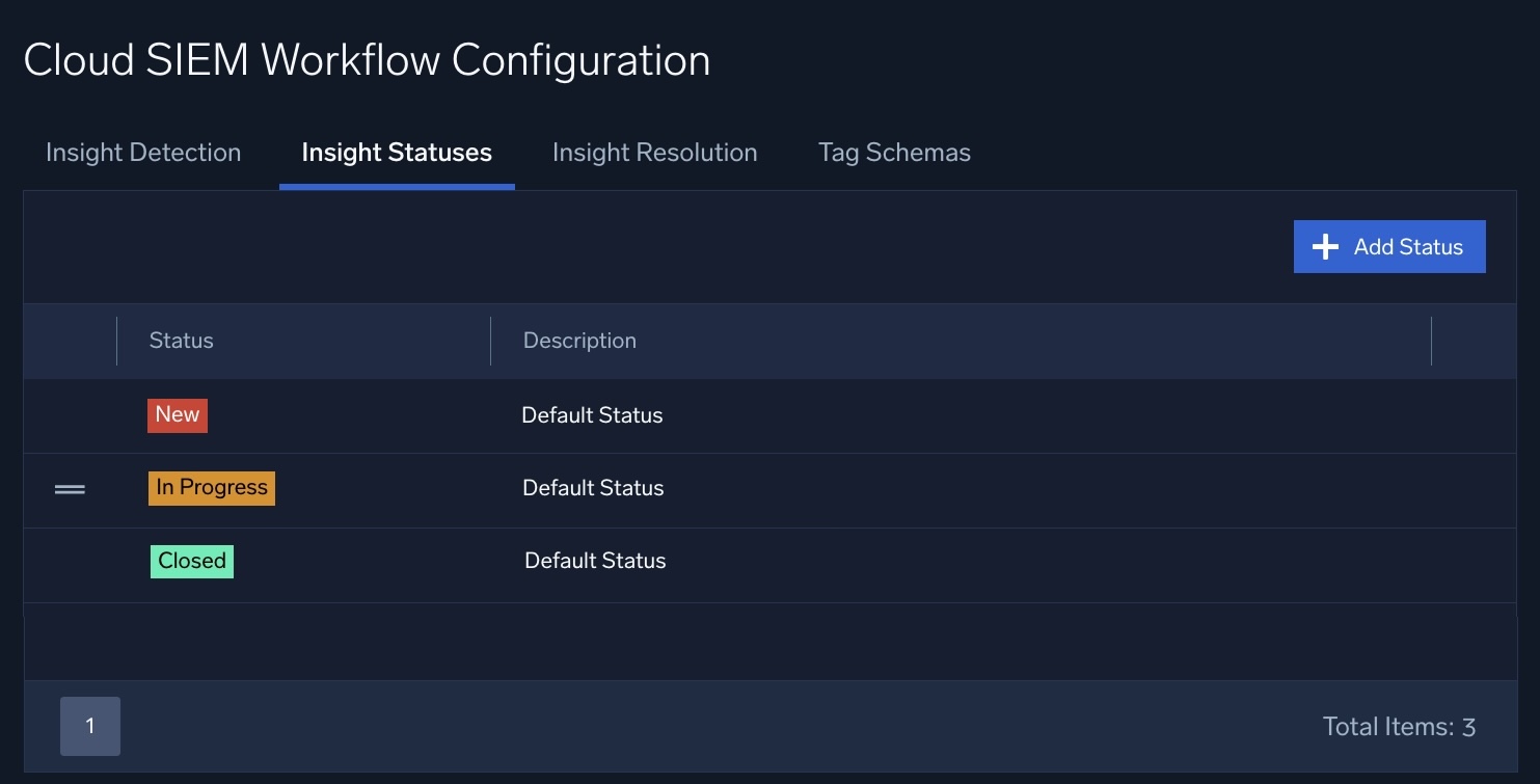Classic UI. In the top Cloud SIEM menu select Configuration, and then under Workflow select Statuses. - This screenshot of the Insight Statuses tab shows the three insight statuses that are preconfigured: