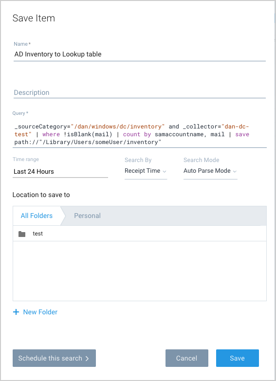 This topic has instructions for using a saved Sumo Logic search to populate a lookup table with Cloud SIEM inventory data. Once you’ve created an inventory lookup table, you can leverage it in log searches, and also use it to normalize hostnames and usernames.