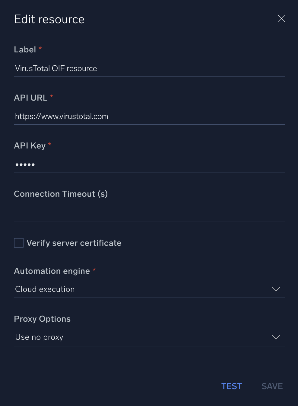 https://www.virustotal.com. - Enter the API Key. See the VirusTotal documentation to learn how to obtain the API key. If you do not already have a VirusTotal account, you need to create one to get an API key.