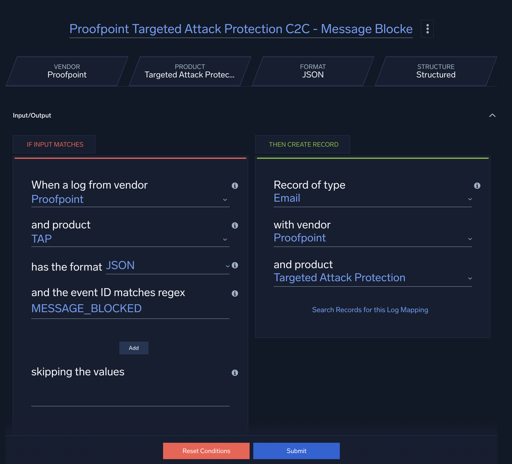 | Fields extracted from Sumo Logic-ingested messages | Extracted Fields JSON | Yes | Cloud SIEM will send the messages to the log mapper with the Format, Vendor, Product, and Event ID pattern you enter in the Sumo Ingest Mapping. |