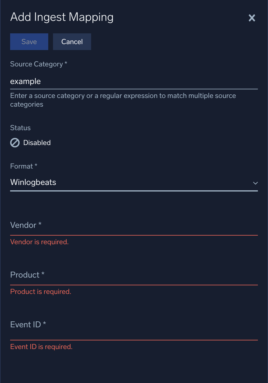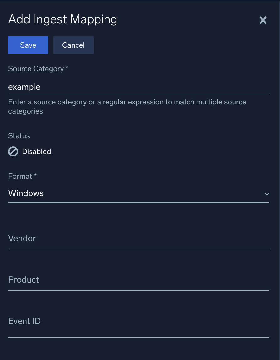 When you fill out the Add Ingest Mapping page, for most of the supported message formats, all you need to select a value for Format. However, for the following formats, you also need to tell Cloud SIEM the Product, Vendor, and Event ID template for the messages: