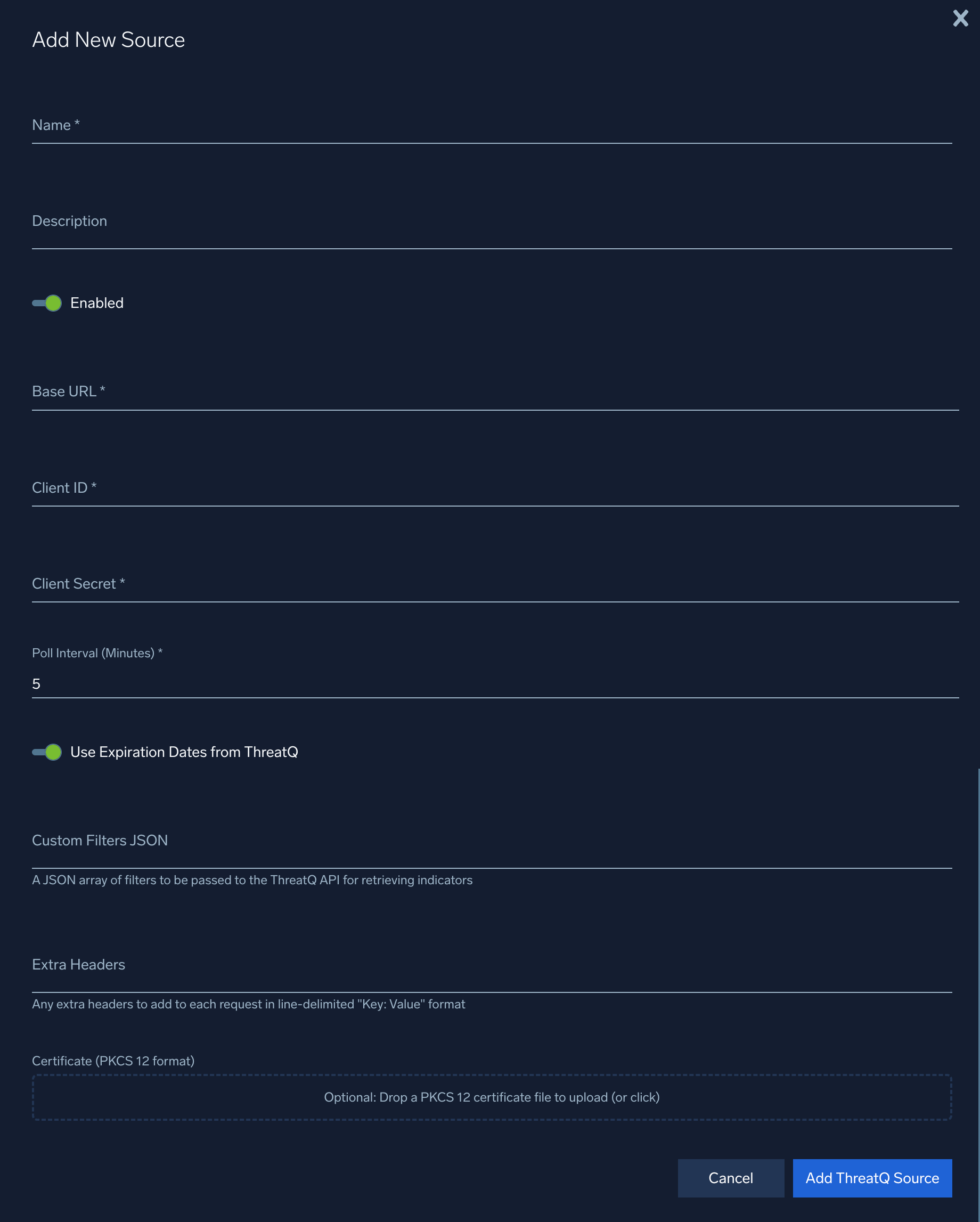 - Certificate. (Optional) A PKCS format certificate is required to authenticate to your environment if you have an SSL API gateway in front of your on-premise ThreatQ service.