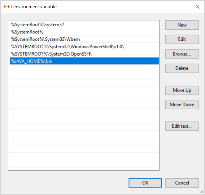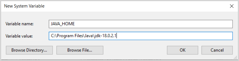 JAVA_HOME- Variable value. Enter the path to your JDK folder, for example: