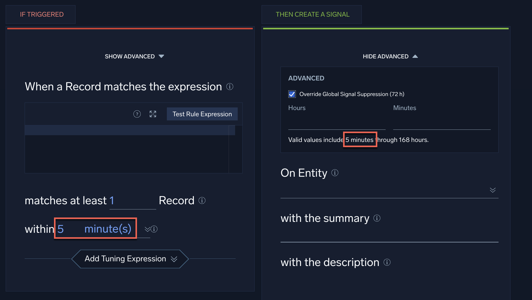 For certain rule types (Threshold, Chain, or Aggregation), the minimum valid value you can enter is determined by the time value in the If Triggered tab.